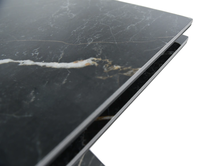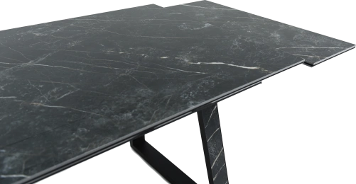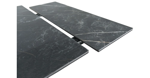 Кухонный стол «Monaco» Quadro, со столешницей из искусственного камня, материал - керамогранит Noir desir Bocciardato, на черных металлических опорах. Отличительной чертой этого стола являются боковые вставки для раскладки стола. Такой механизм успешно себя зарекомендовал и пользуется постоянным спросом у наших покупателей. На вставках опор, также используется керамогранит. Стоит отметить еще одну особенность стола «Monaco» Quadro — это выбор, как со столешницей из керамогранита, так и покрытия из закаленного, матового стекла OPTI. На столы с керамикой, между столешницей и вставкой, приклеивается силиконовая полоска, она необходима для сохранения целостности керамики при трансформации стола.