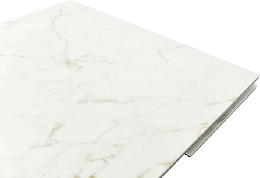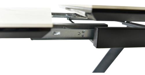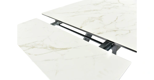 Кухонный стол «Monaco» со столешницей из искусственного камня, материал - керамогранит Calacata vaglioro, на черных металлических опорах. Отличительной чертой этого стола являются боковые вставки для раскладки стола. Такой механизм успешно себя зарекомендовал и пользуется постоянным спросом у наших покупателей. Стоит отметить еще одну особенность стола «Monaco» — это выбор, как со столешницей из керамогранита, так и покрытия из закаленного, матового стекла OPTI. На столы с керамикой, между столешницей и вставкой, приклеивается силиконовая полоска, она необходима для сохранения целостности керамики при трансформации стола.