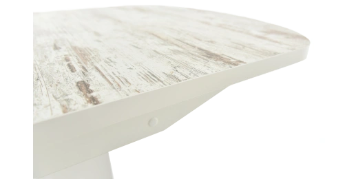 Отличительной чертой этого стола является одна опора, выполненная из МДФ в цвете подстолья. К опоре крепится непосредственно столешница. Стол раздвижной, механизм раскладки — бабочка, причем покрытие вкладыша так же изготовлено из пластика, что позволяет столу не терять эстетической окраски даже в разложенном варианте. Стоит отметить еще одну особенность стола «Корсика» — это выбор покрытия.