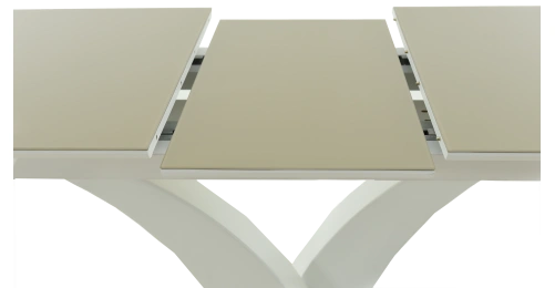 Стол раздвижной, механизм синхронной раскладки — с подъемным механизмом, причем покрытие вкладыша так же изготовлено из закалённого стекла, что позволяет столу не терять эстетической окраски даже в разложенном варианте.
