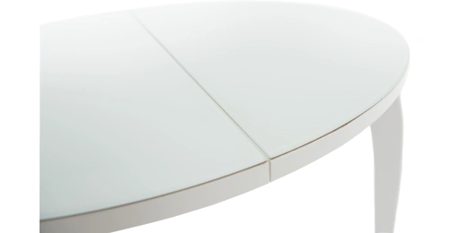 Кухонный стол Ривьера с круглой столешницей белого цвета и белым каркасом. Материал изготовления подстолья: ЛДСП толщиной 18 мм. Используются ножки из массива №7.