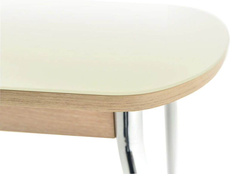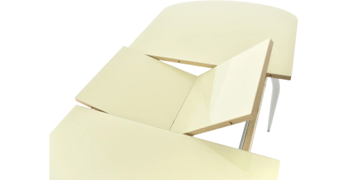 Кухонный стол Ривьера СВ со стеклянной столешницей молочного цвета и каркас хром, вставкой «бабочка», также дублирующей стеклянную столешницу. Материал изготовления подстолья: ЛДСП толщиной 18 мм. Ножки выполнены из металла .