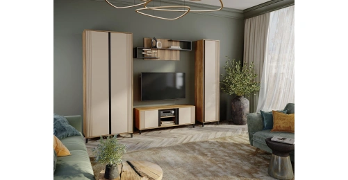 Стильная и современная модульная гостиная "Богемия" изготовлена из высококачественных материалов. Корпус изготовлен из ламинированной древесностружечной плиты толщиной 16мм. Фасады выполнены из МДФ толщиной 19мм и покрыты пленками ПВХ с эффектом Soft touch. Это обеспечивает не только стильный внешний вид, но и приятные тактильные ощущения. Цвета фасадов - зеленый и бежевый, гармонично сочетаются друг с другом и с корпусом мебели. Дизайн гостиной подчеркивает эффектный контраст материалов и цветов.