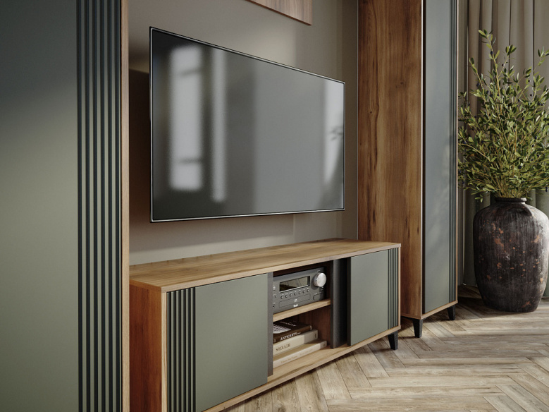 Стильная и современная модульная гостиная "Богемия" изготовлена из высококачественных материалов. Корпус изготовлен из ламинированной древесностружечной плиты толщиной 16мм. Фасады выполнены из МДФ толщиной 19мм и покрыты пленками ПВХ с эффектом Soft touch. Это обеспечивает не только стильный внешний вид, но и приятные тактильные ощущения. Цвета фасадов - зеленый и бежевый, гармонично сочетаются друг с другом и с корпусом мебели. Дизайн гостиной подчеркивает эффектный контраст материалов и цветов.