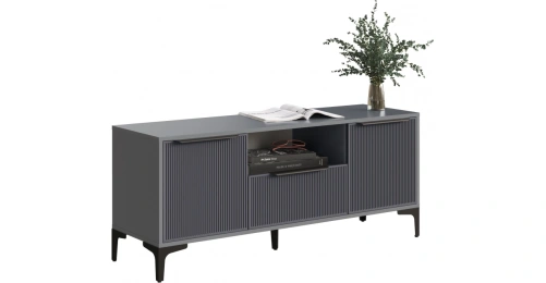 В центре композиции располагается ТВ-тумба размером 135 × 40,6 × 56,5 см. Её эргономичная конструкция включает пять полок (одна открытая), две распашные дверцы и выдвижной ящик для удобного размещения техники и хранения аксессуаров.