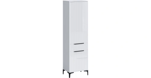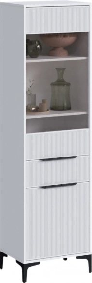 По бокам или рядом друг с другом можно расположить два высоких шкафа размером 55 × 40,3 × 196 см. Шкаф-витрина с стеклянной верхней дверцей отлично подходит для демонстрации декора и книг, а шкаф-пенал обеспечивает дополнительное закрытое хранение. Каждый из шкафов оснащен выдвижным ящиком и удобными полками.