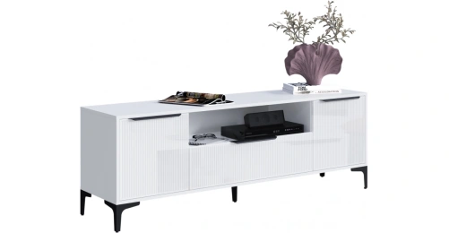 В центре композиции можно разместить вместительную ТВ-тумбу размером 165 × 40,3 × 65,6 см. Её продуманная организация включает пять полок (одна открытая), две распашные дверцы и удобный выдвижной ящик – всё для комфортного размещения техники и хранения аксессуаров.