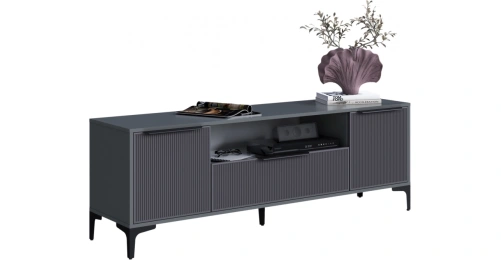 В центре композиции можно разместить вместительную ТВ-тумбу размером 165 × 40,3 × 65,6 см. Её продуманная организация включает пять полок (одна открытая), две распашные дверцы и удобный выдвижной ящик – всё для комфортного размещения техники и хранения аксессуаров.