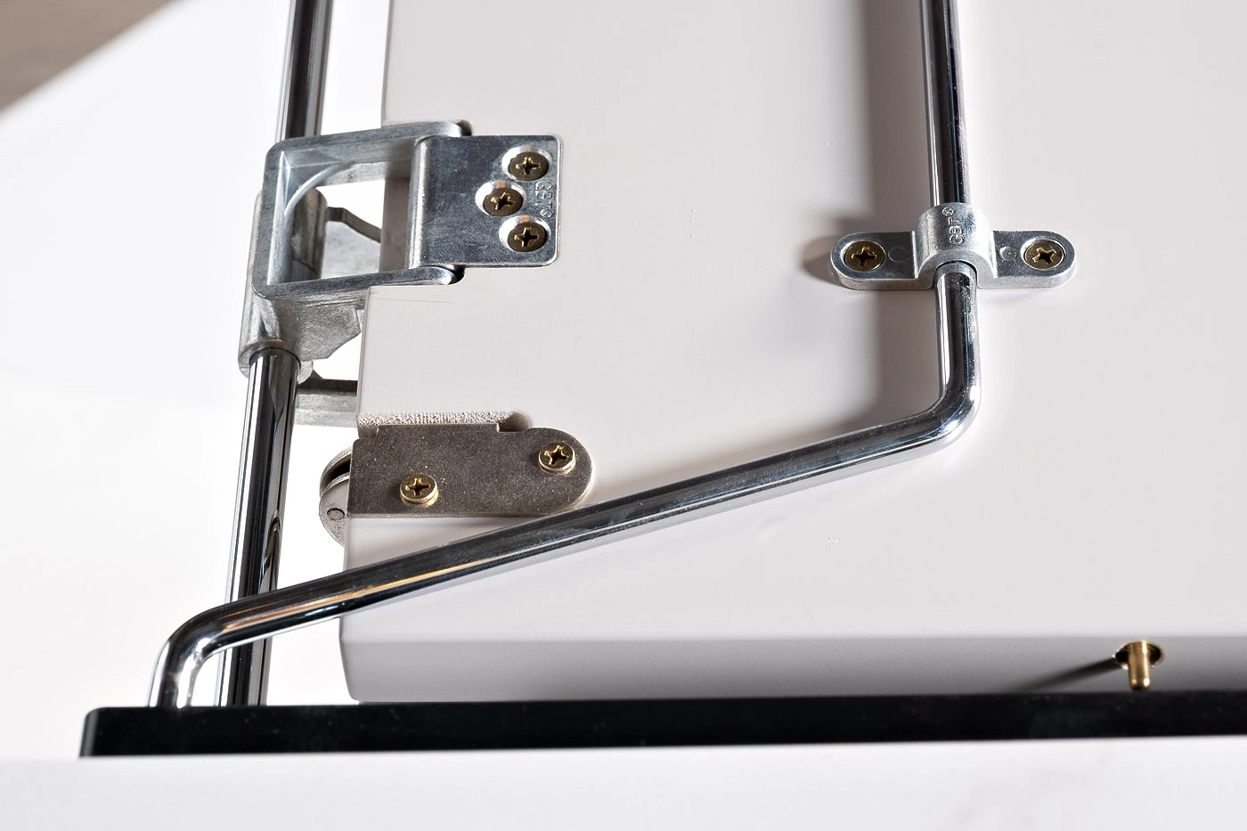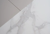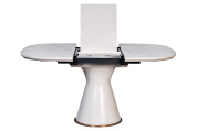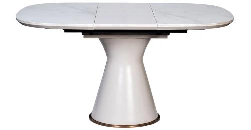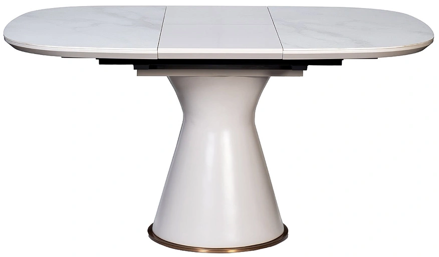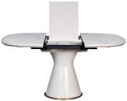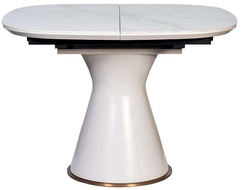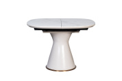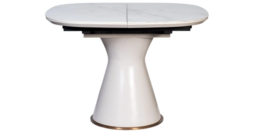 Красивый раскладной стол украсит вашу гостиную или столовую. В сложенном состоянии столешница 110*110см из белой керамики с мраморным рисунком подходит для небольших семейных обедов или завтраков, а в разложенном до 150см - готова к приему гостей. Вставка в центральной части позволяет увеличить длину стола на 40см. Современный механизм трансформации позволяет легко разложить стол перед приходом гостей, а затем в несколько движений вернуть его в исходное состояние. К столу удобно придвигать стулья, поскольку традиционные ножки заменены на центральную опору. Устойчивая белая опора отделана золотым металлическим ободком в нижней части, что придает столу особую элегантность.