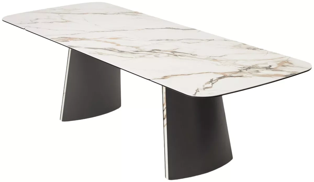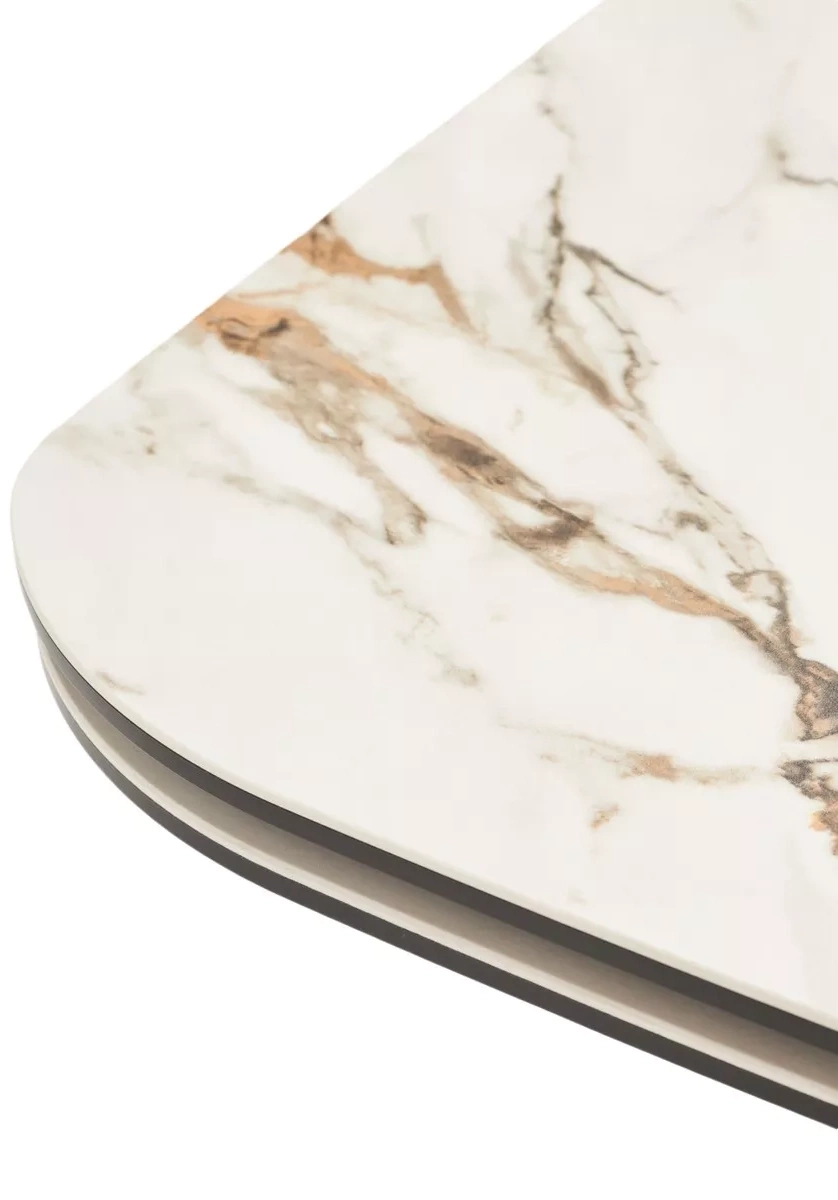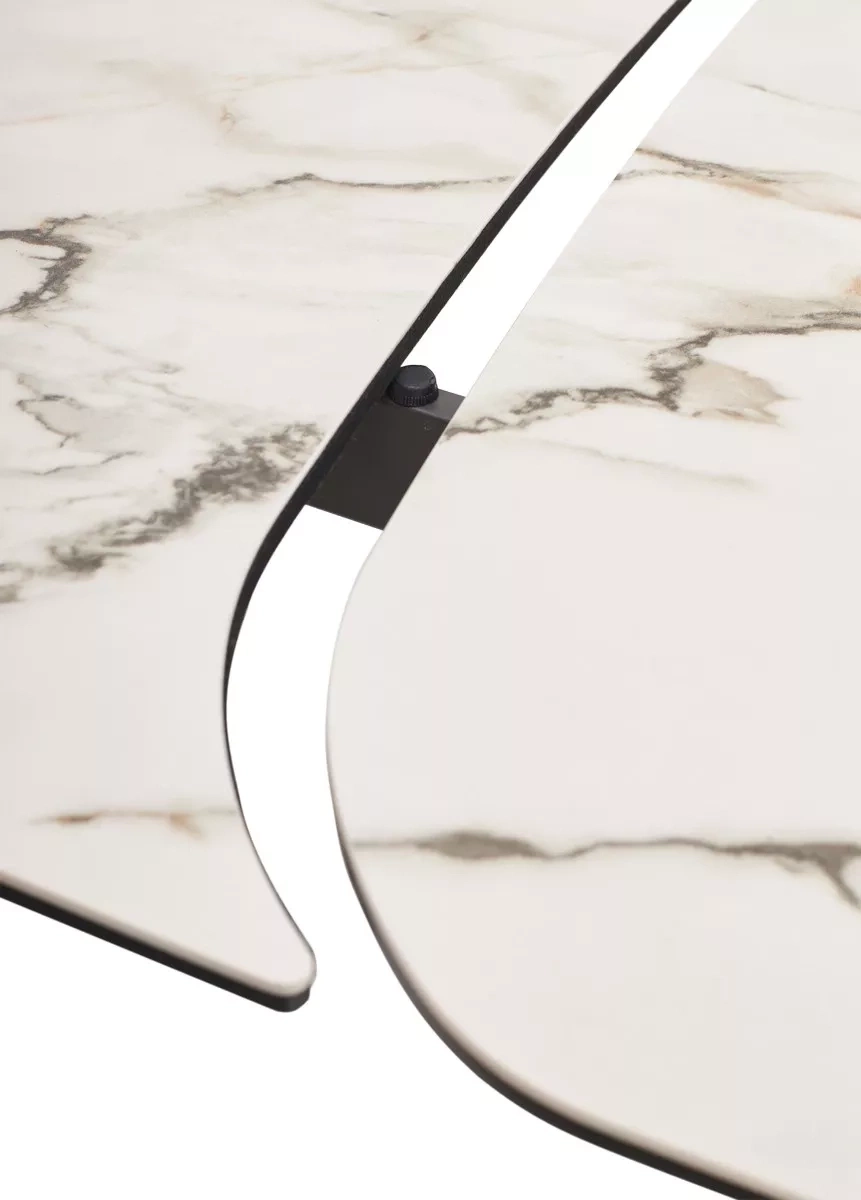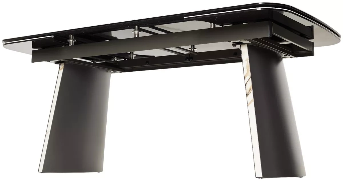 - двухсторонняя торцевая система раскладывания, две независимые вставки по краям по 40 см позволяют увеличить длину столешницы на 220 или 260 см при необходимости, итальянская керамика, толщина столешницы 11 мм (3 мм керамика + 8 мм закаленное стекло), не впитывает загрязнения, термостойкая;