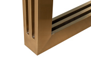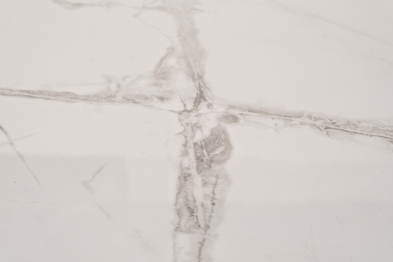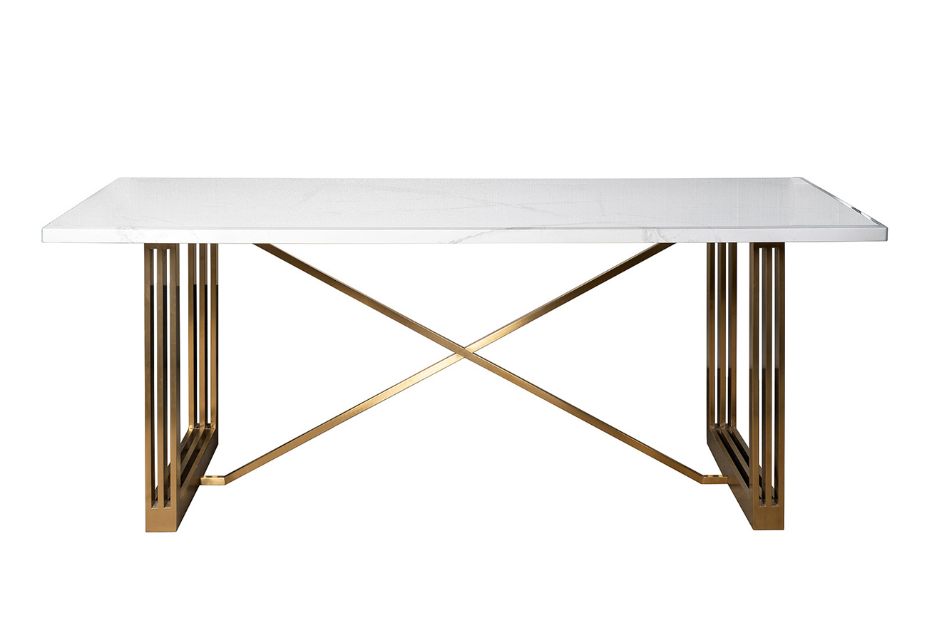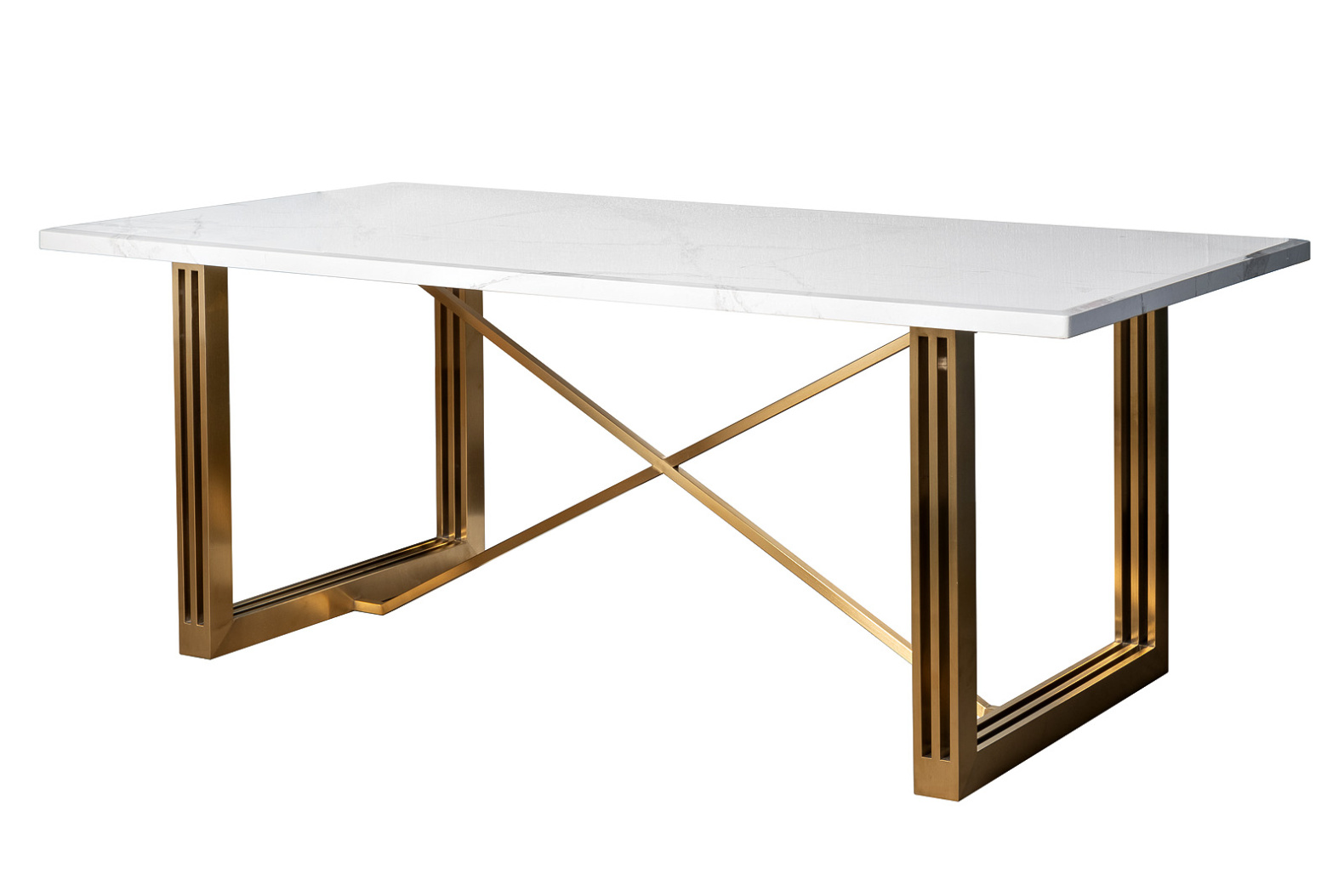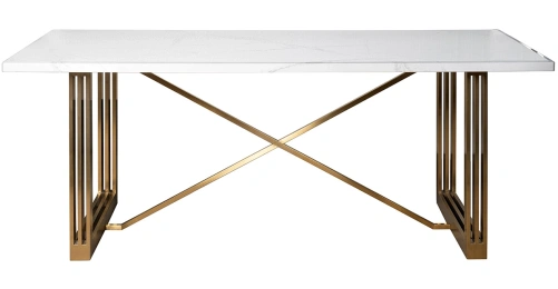 Обеденный стол с надежным основанием из золотой нержавеющей стали и имитирующей мрамор столешницы из МДФ. Обеденный прямоугольный стол прекрасно дополнит интерьер современной кухни, внесет нотку изысканности и красоты в обстановку столовой. Оригинальное основание из «золотой» брашированной нержавеющей стали обеспечивает устойчивость всей конструкции и подчеркивает эстетику мебели. Обеденный стол в современном стиле смотрится дорого и презентабельно, органично вписывается в обстановку ар-деко, шебби-шик, модерн, фьюжн. Толщина столешницы - 36мм, в зависимости от освещения тон мрамора может казаться сероватым, от партии к партии оттенок может незначительно отличаться.