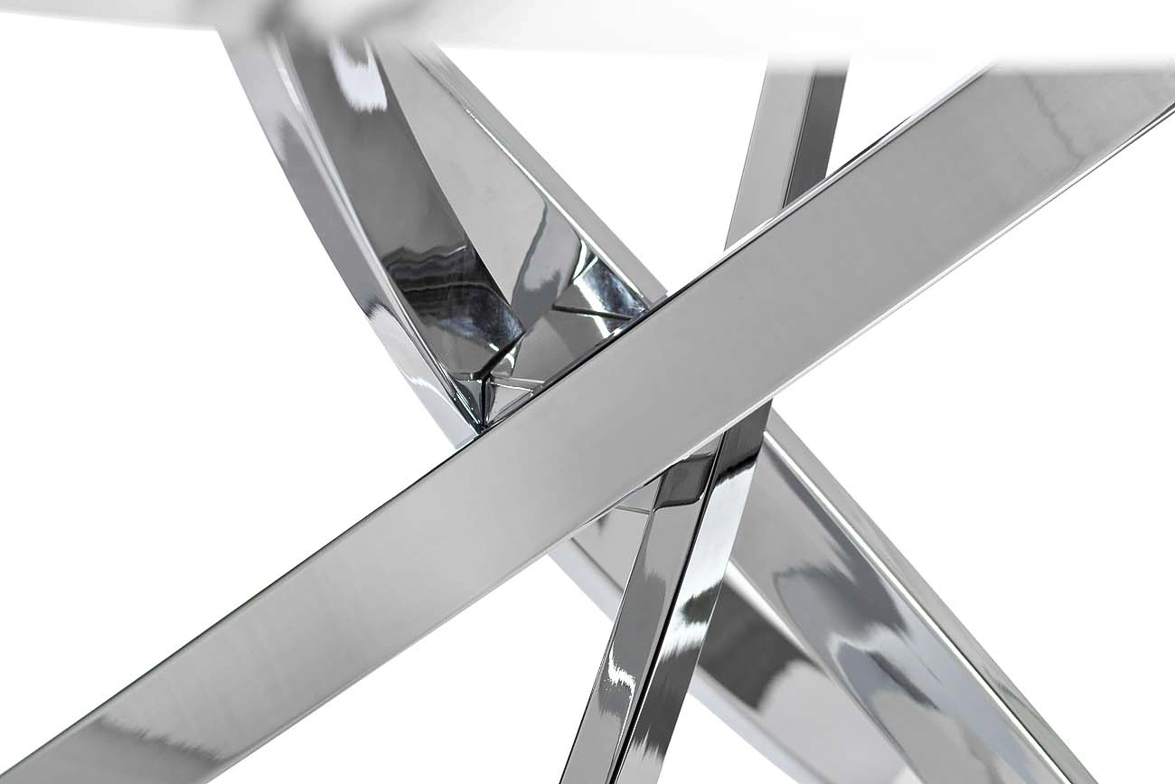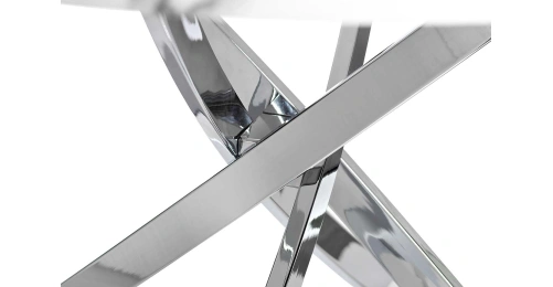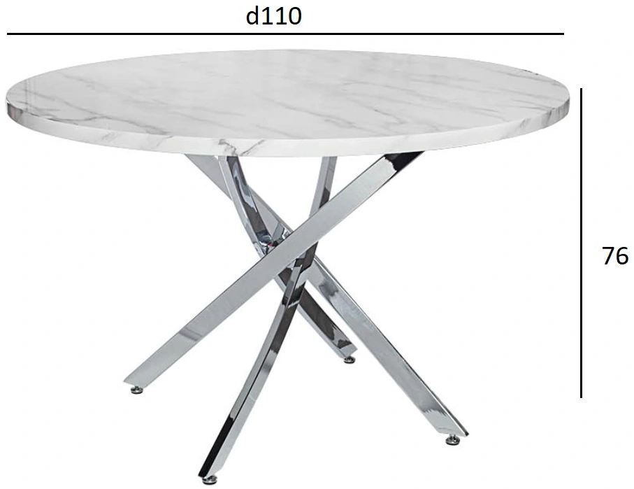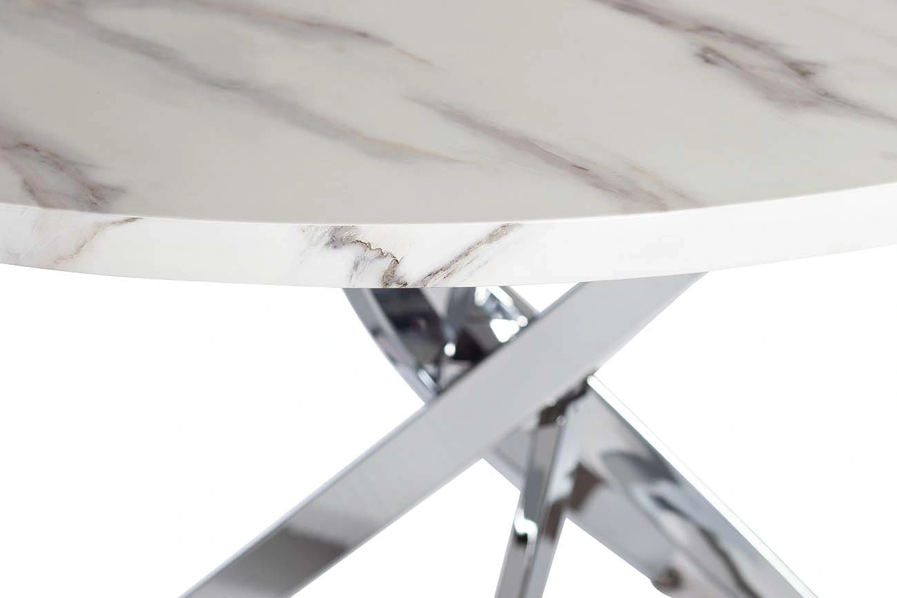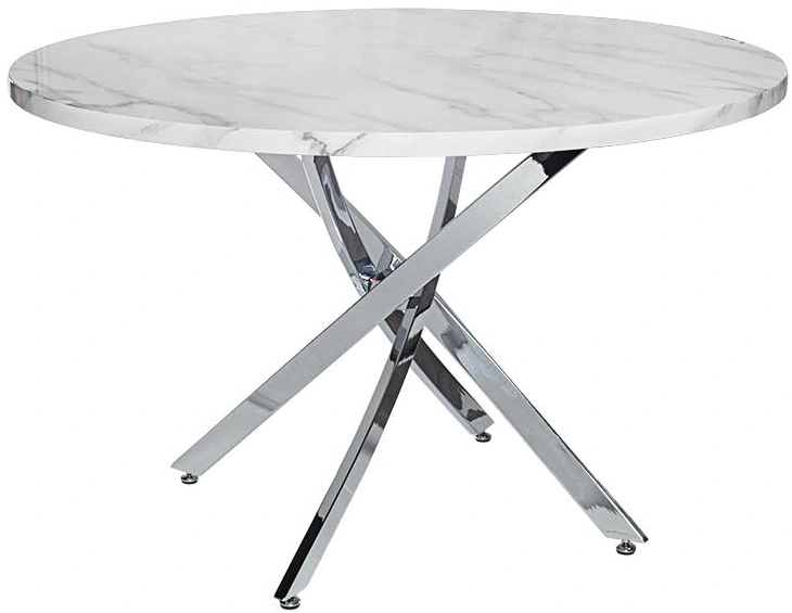 Обеденный круглый стол – классическое решение для кухни, в которой устраиваются семейные ужины и уютные посиделки. Круглая столешница из МДФ с имитацией светлого мрамора выглядит эффектно и сохраняет эстетику камня годами. За устойчивое положение белого обеденного стола отвечают скрещенные под столешницей хромированные ножки – именно они придают мебели оригинальности и изящества. Данная мебель хорошо впишется в современный интерьер со светлым кухонным гарнитуром и серебристым декором. Толщина столешницы 20мм.