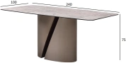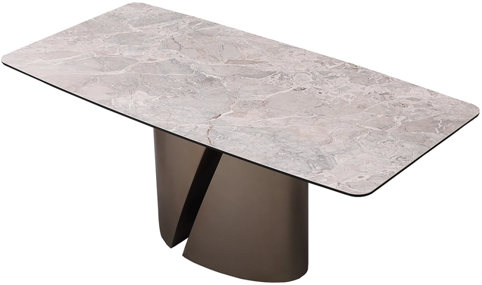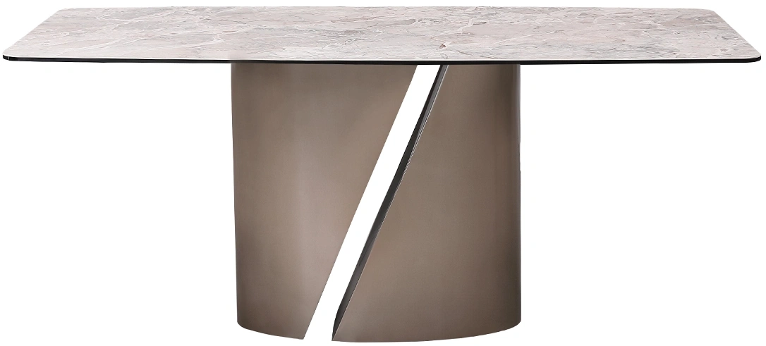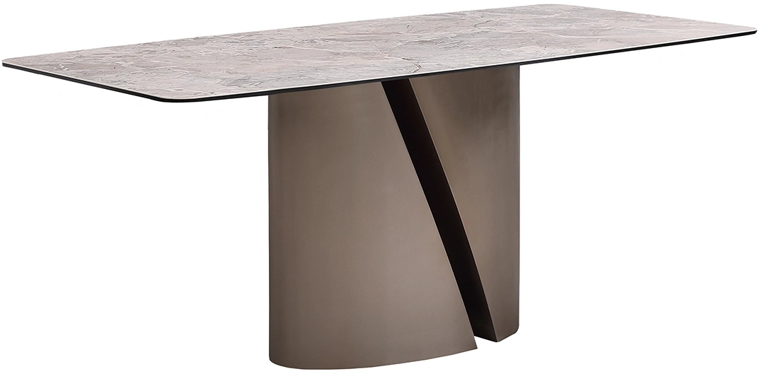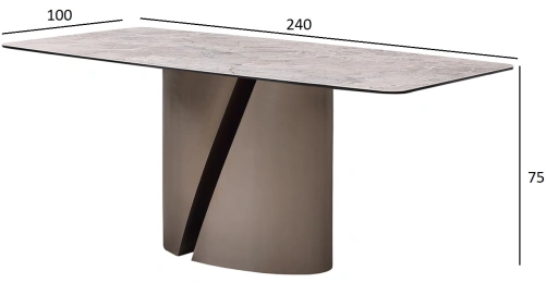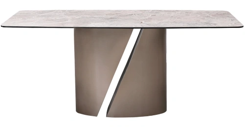 Большой обеденный стол с оригинальным основанием из нержавеющей стали с износостойкой двухслойной столешницей из керамики и закаленного стекла. Спокойный цвет сероватого мрамора на столешнице позволяет акцентировать красоту изысканной посуды, столовых приборов, и в полной мере насладиться трапезой - за счет размера столешницы сервировка может вместить много разных блюд и обеспечить достаточно личного пространства каждому. Особенностью стола является основание, зрительно разделенное по диагонали. Оно составлено из двух опор, между которыми есть зазор. Толщина столешницы 13мм (3мм керамика и 10мм стекло).