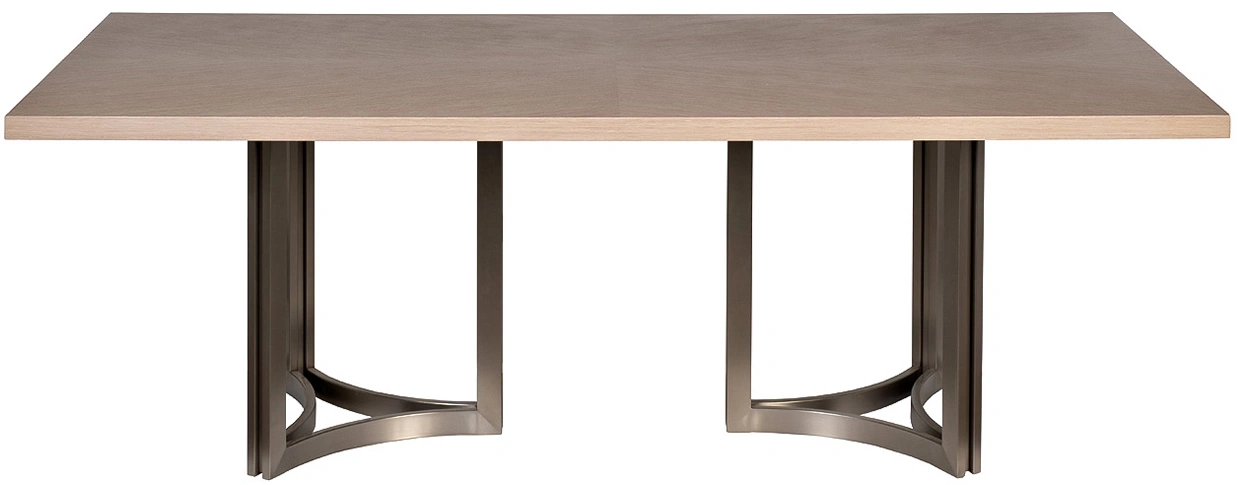 Прямоугольный обеденный стол воплощает последние тренды интерьерной моды – практичность, натуральность материалов, лаконичность дизайна. В конструкции гармонично сочетаются благородная фактура дерева и изысканный блеск нержавеющей стали. Вместо традиционных ножек столешница установлена на металлические опоры, за счет чего большой обеденный стол выглядит дорого и аристократично. Мебель отличают превосходное качество, премиальные материалы, ультрамодный дизайн. На нашем сайте можно купить обеденный стол вместе с креслами или стульями аналогичного дизайна.Просьба обратить внимание, что при перемещении стол следует держать только за основание, а не столешницу! Иначе столешница может потрескаться.