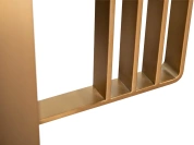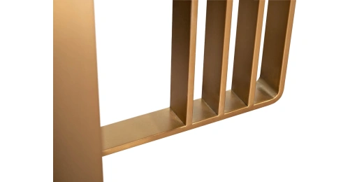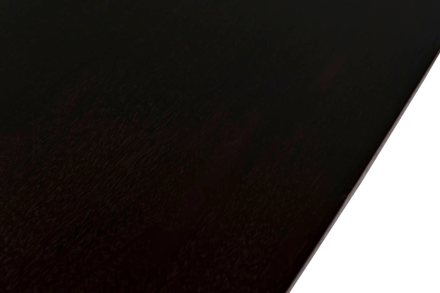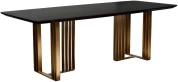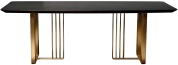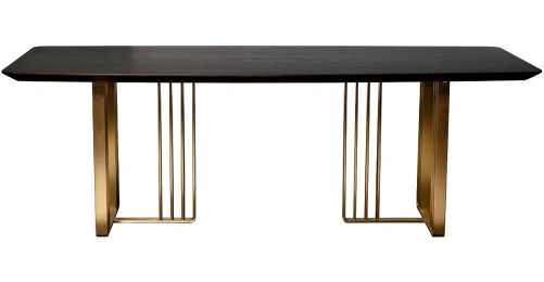 Дизайнерский обеденный черный стол станет эффектным украшением современной столовой или кухни в стилистике ар-деко. Столешница выполнена в глубоком черном цвете, из МДФ в шпоне, без дополнительных рисунков. Главный акцент сделан на опоре необычной формы из нержавеющей стали с эффектным золотым блеском. За счет такого решения обеденный стол на металлических ножках выглядит изящным, но при этом остается прочным, устойчивым и монументальным. Просьба обратить внимание, что при перемещении стол следует держать только за основание, а не столешницу! Иначе столешница может потрескаться.