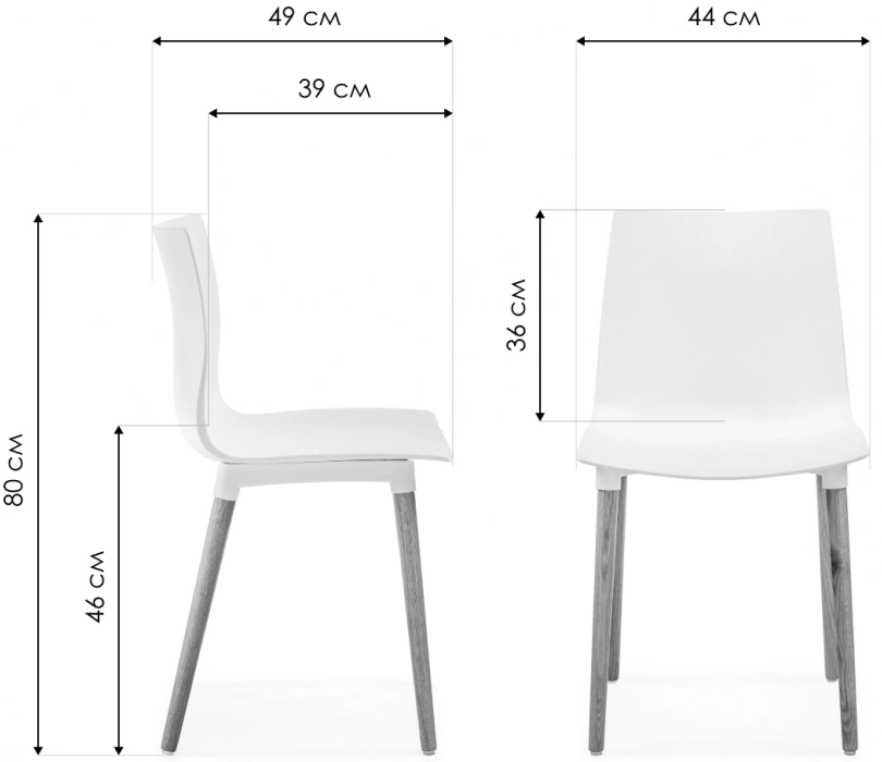 Габариты стула продуманы для комфортного использования и рационального размещения в пространстве. Общая ширина составляет 44 см, глубина — 49 см, а высота достигает 80 см. Сиденье имеет ширину 44 см и глубину 39 см, при этом его высота составляет 46 см — эргономичный параметр, обеспечивающий удобство при эксплуатации.
