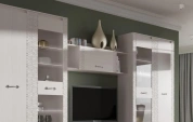 Полка крепится к боковинам двух любых шкафов или витрин из набора для гостиной. На боковинах этих элементов при сборке сверлятся по четыре сквозных отверстия диаметром 7 мм, путём рассверливания уже имеющихся отверстий меньшего диаметра.