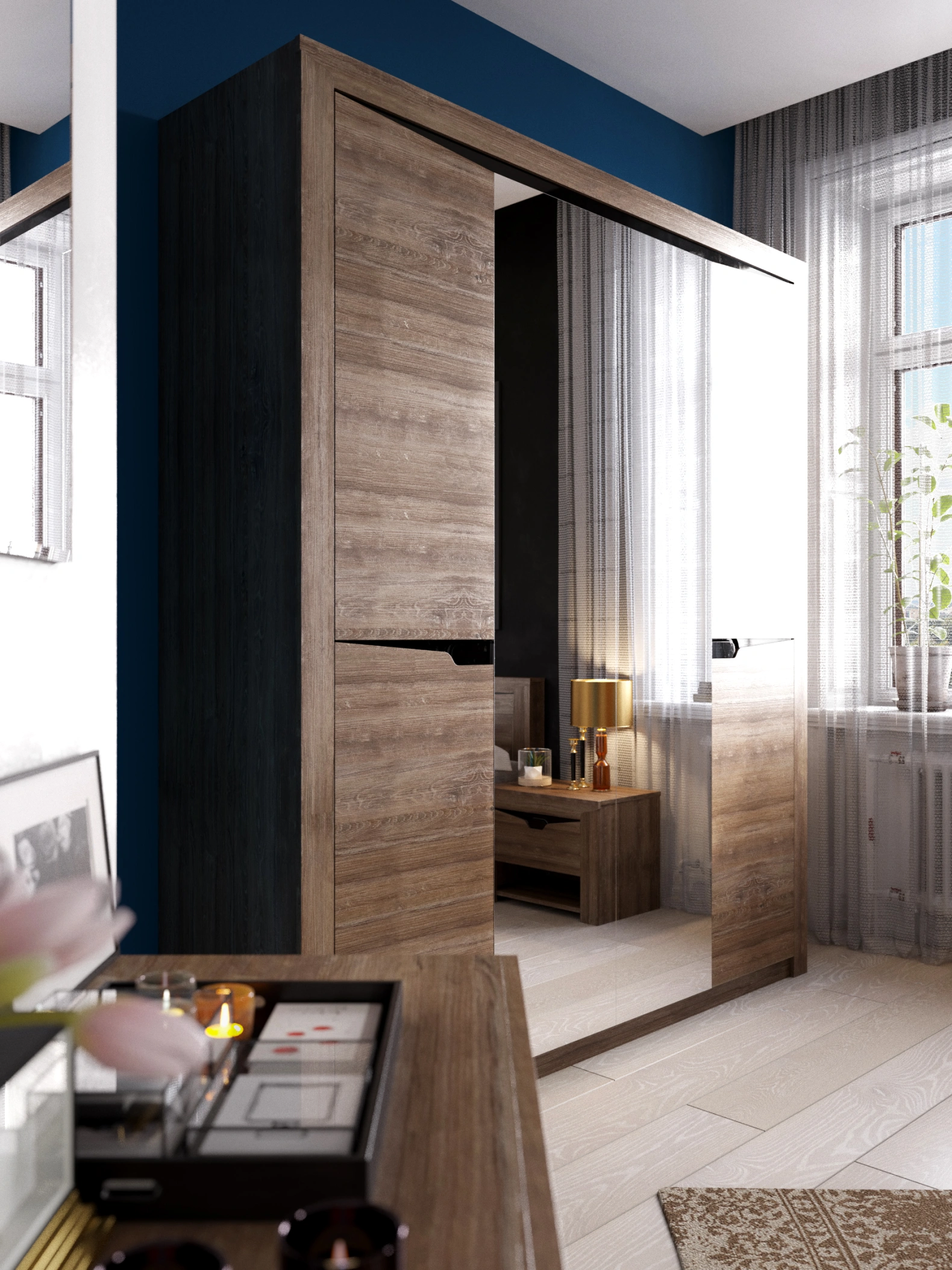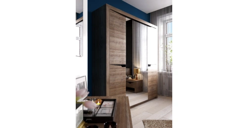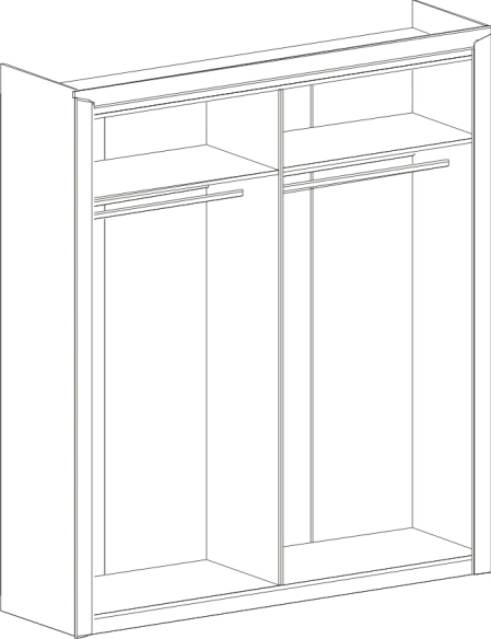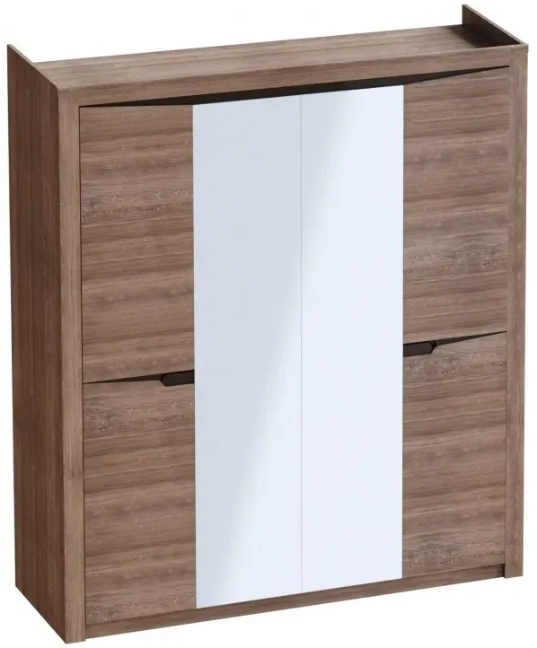 Четырёхдверный шкаф "Соренто" с зеркалом отлично подойдёт для спальни или прихожей и станет прекрасным дополнением к вашему интерьеру. На боковых дверях имеются декоративные вырезы, выполняющие функцию ручек. Одно из отделений шкафа можно изменить комплектом из трёх полок (приобретается отдельно).