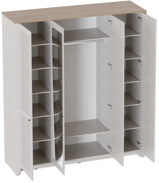 УФ-фотопечать полосок на фасадах в обрамлении пластиковых молдингов придает изделию оригинальный стиль современной классики. В центральной части шкафа расположена штанга для одежды, а также верхняя и нижняя полки, каждая из которых разделена на два отделения. Правая и левая части шкафа имеют по пять полок высотой 332 мм каждая. Задняя стенка шкафа изготовлена из ХДФ. На опорах размещены войлочные подпятники. Высота опор 104 мм. Зеркало выполнено с фацетом.