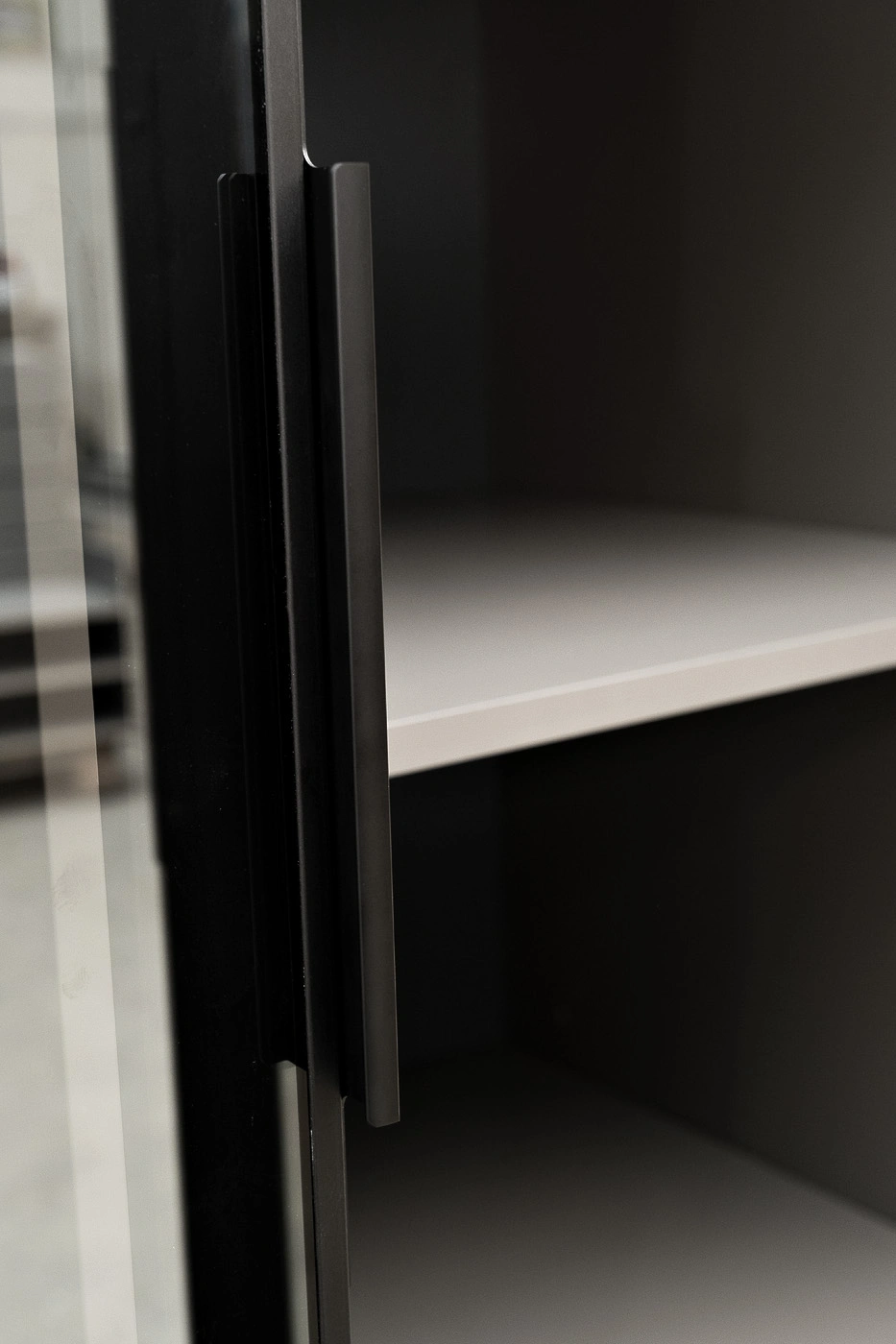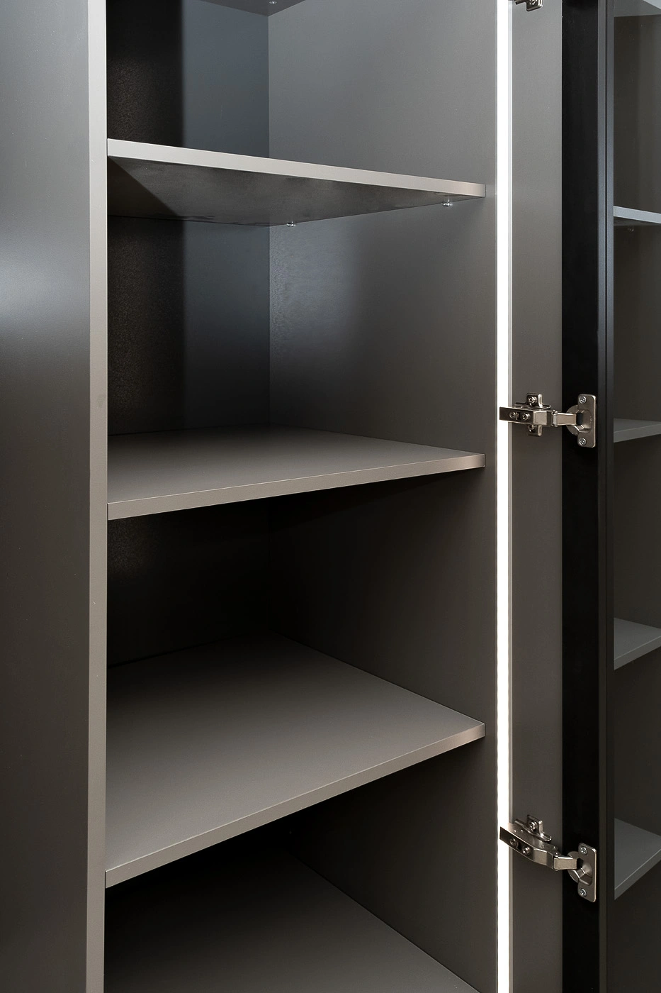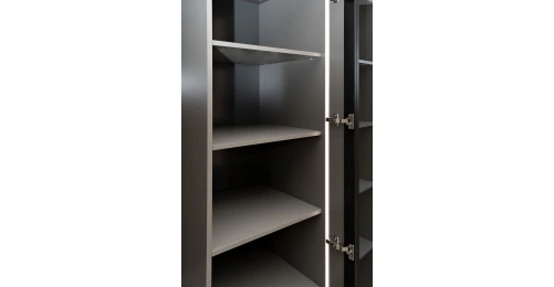 Изящный двухдверный шкаф с полками, выполненный в современном стиле, станет украшением современной гостиной или спальни. Корпус шкафа изготовлен из ЛДСП цвета серый кобальт, а дверцы - из тонированного стекла, которое скрывает содержимое от посторонних глаз. Шкаф идеально подойдет для хранения посуды, книг или одежды, добавляя в пространство легкость и изящество. Шкаф двухдверный c полками, дверца- стекло тонированное (ЛДСП серый Кобальт 6299BS, тм Kronospan)