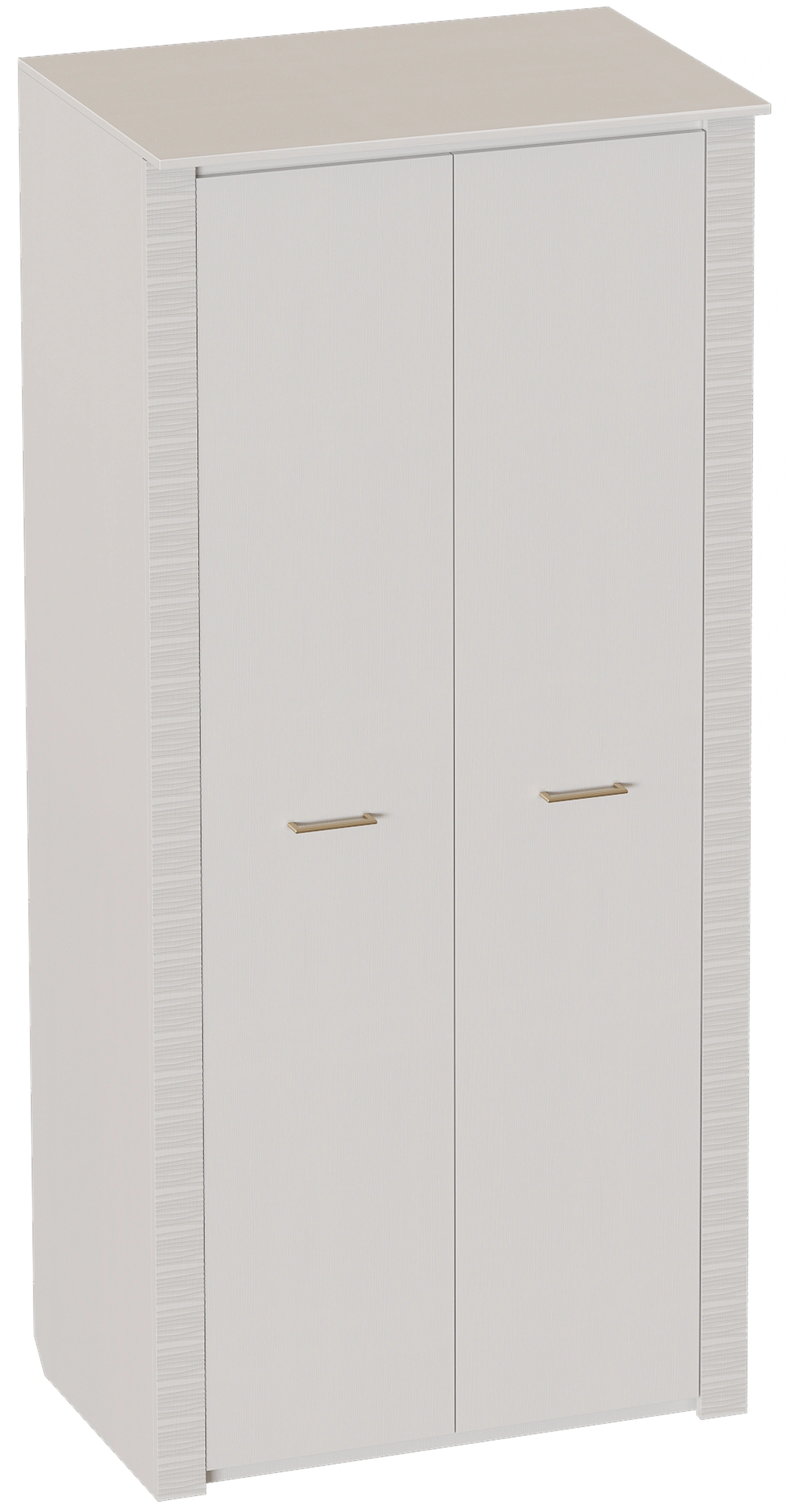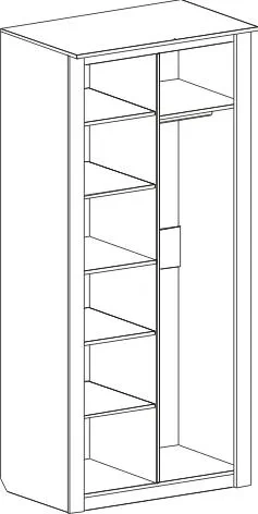 Двухдверный шкаф оснащен двумя отделениями: для белья с четырьмя съёмными и центральной жёсткой полкой; платяное с жесткой полкой и продольной стальной штангой. В колпаке шкафа имеется паз для светильника, входящего в комплект. Блок питания приобретается отдельно, и рассчитан на подключение шести светильников.