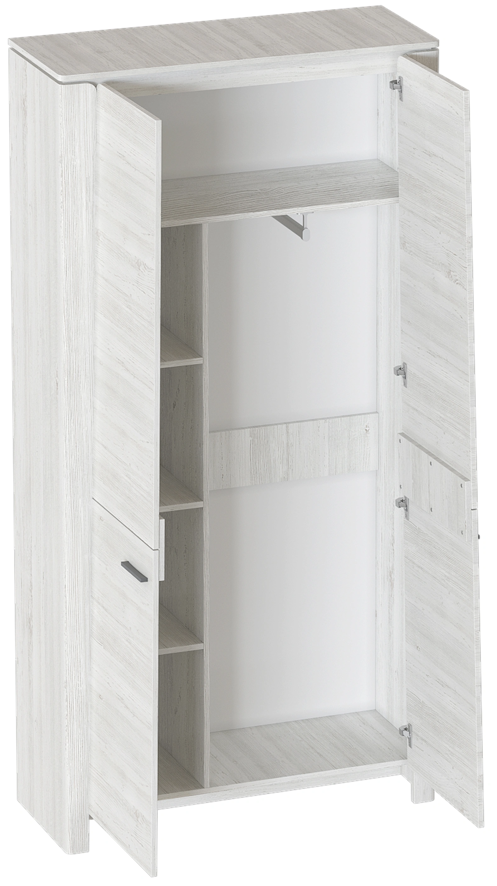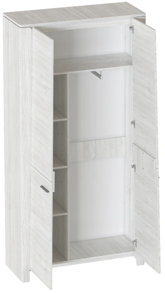 Внутреннее пространство шкафа разделено полкой на платяное с продольной стальной штангой и верхнее отделение для хранения белья. Фасады выполнены из МДФ, преимуществами данного материала являются влагостойкость, экологичность, гипоаллергенность, надёжность и долгий срок эксплуатации.