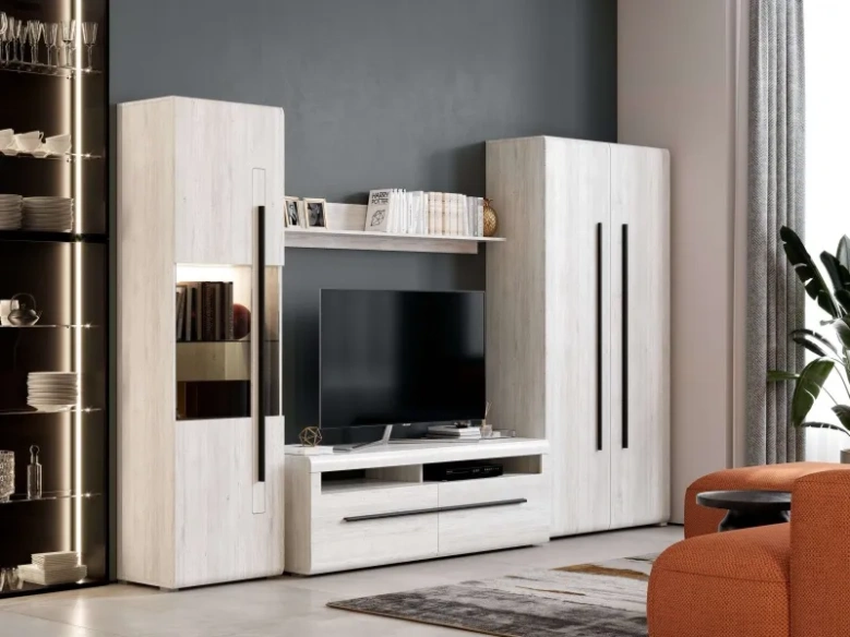 Корпус шкафа изготовлен из ЛДСП, фасады с закругленными линиями - из МДФ. Стиль изделия подчеркивают черные металлические ручки. Внутреннее пространство шкафа разделено на верхнюю широкую полку по горизонтали и на два отделения по вертикали: платяное и для хранения вещей. В платяном отделении находится одна поперечная штанга и одна стационарная полка. В отделении для хранения вещей установлено четыре съёмные полки.