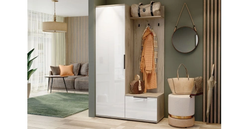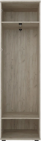 Петли четырехшарнирные с системой плавного закрывания. Ручки пластиковые – цвет антрацит. Опоры пластиковые – черного цвета. В шкафу предусмотрена штанга для одежды.