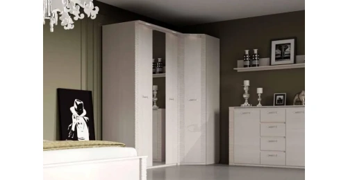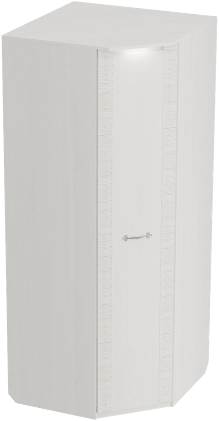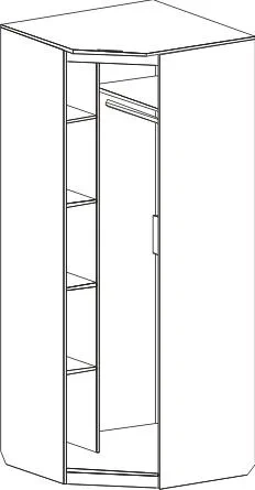 Угловой шкаф оснащен двумя отделениями: для белья с четырьмя жёсткими полками; платяное с жесткой полкой и продольной стальной штангой. В колпаке шкафа имеется паз для светильника, входящего в комплект. Блок питания приобретается отдельно, и рассчитан на подключение шести светильников.