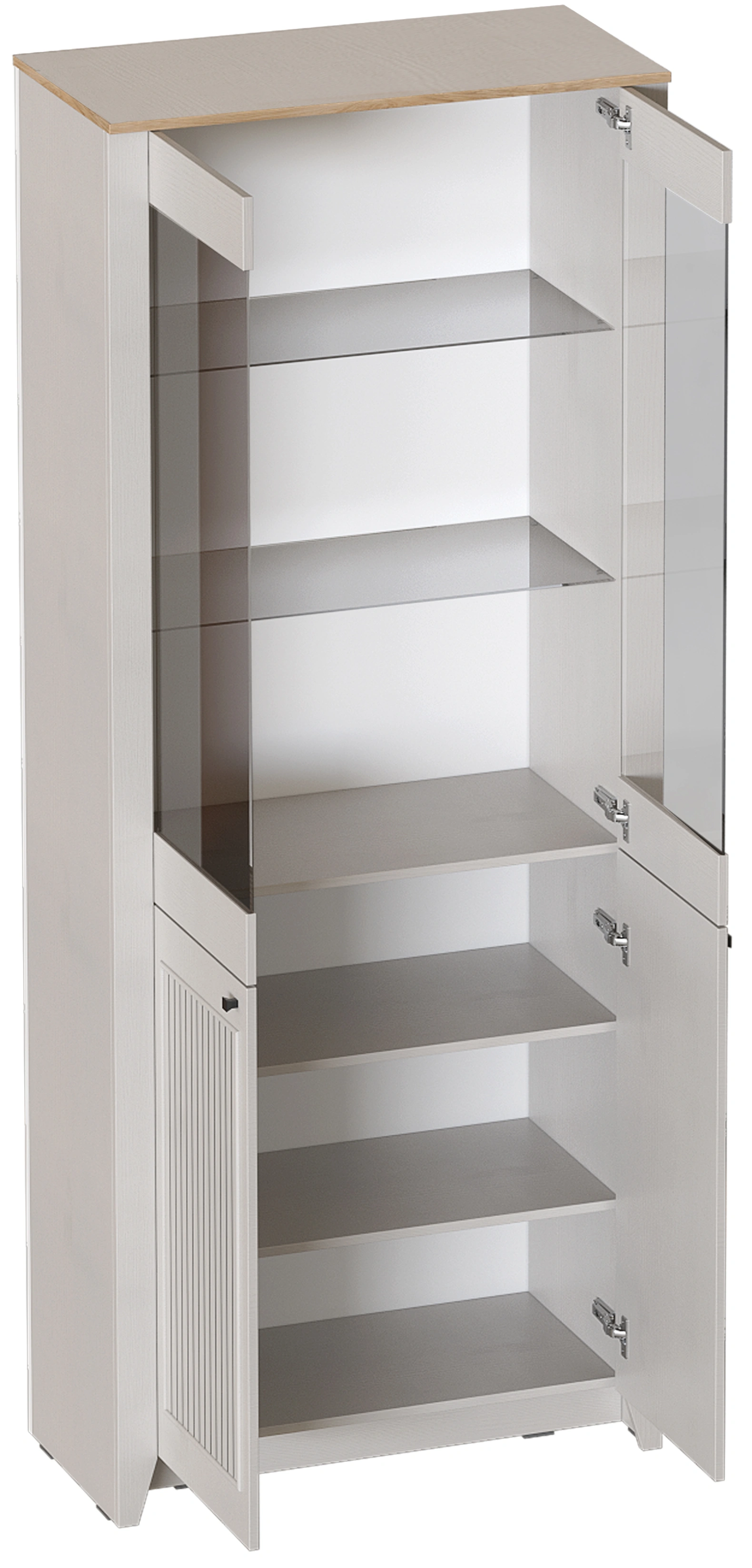 Шкаф-витрина двухдверный "Валенсия" выполнен в комбинации Дуб натуральный светлый / Персидский жемчуг. Внутреннее пространство шкафа представляет собой два отделения. Нижнее пространство включает в себя съемные полки. Верхнее отделение со стеклянными полками. Петли без амортизаторов. Шкаф выполнен из безопасных, качественных материалов, что гарантирует долговечность и сохранение первоначального вида на протяжении долгого времени.