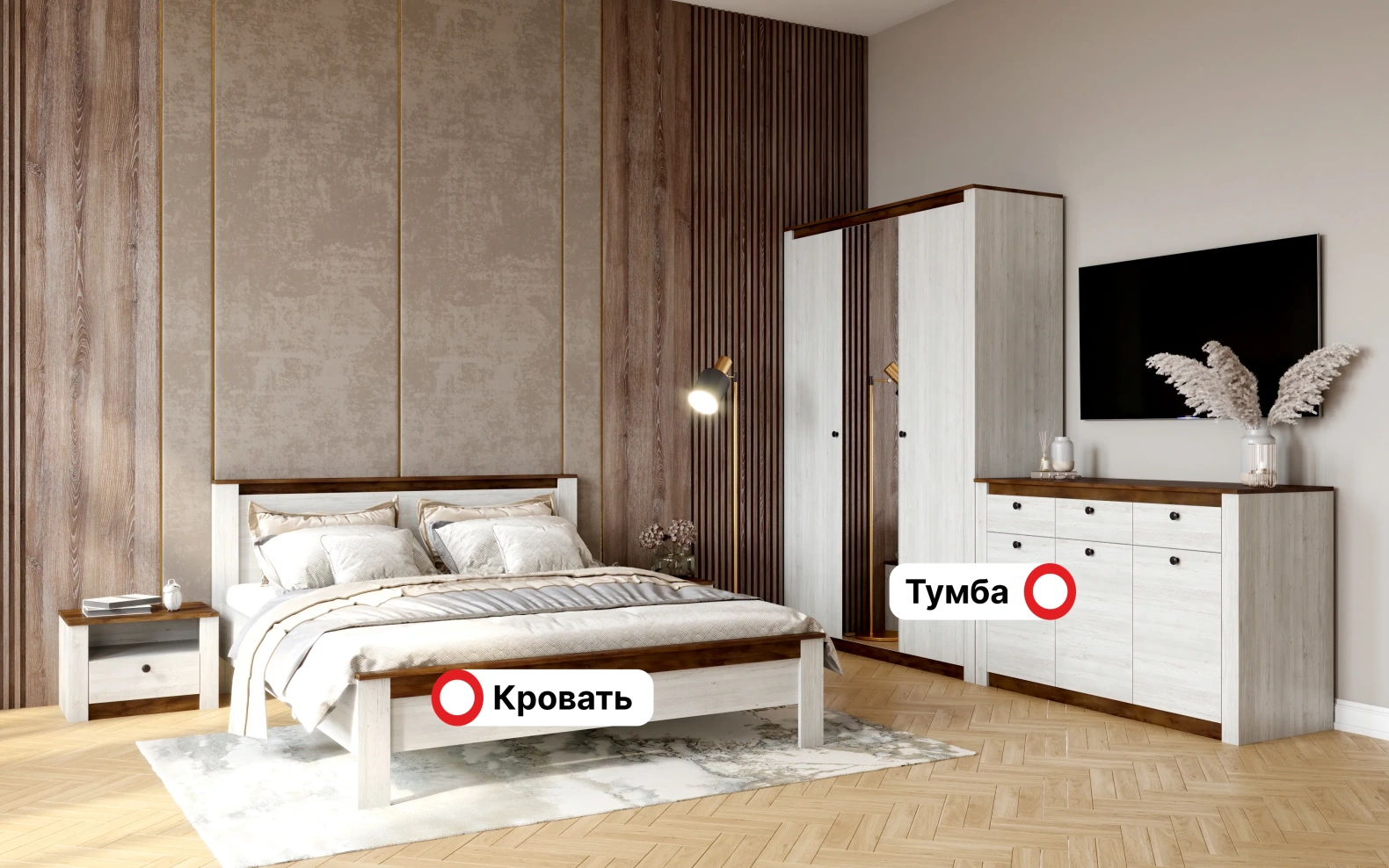 Этот комплект мебели для спальни идеально подойдет для создания гармоничного и стильного пространства, где вы сможете расслабиться и отдохнуть после насыщенного дня.