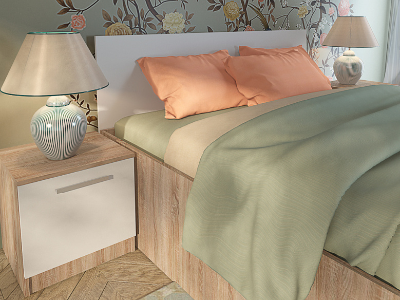 Корпус спальни изготовлен из 16 мм ламинированной древесностружечной плиты цвет –«Белый» и «Дуб Сонома». Торцевые поверхности корпуса закромлены кромками полипропилен. Фасады изготовлены из 16 мм ламинированной древесностружечной плиты цвет –«Белый» и «Дуб Сонома».