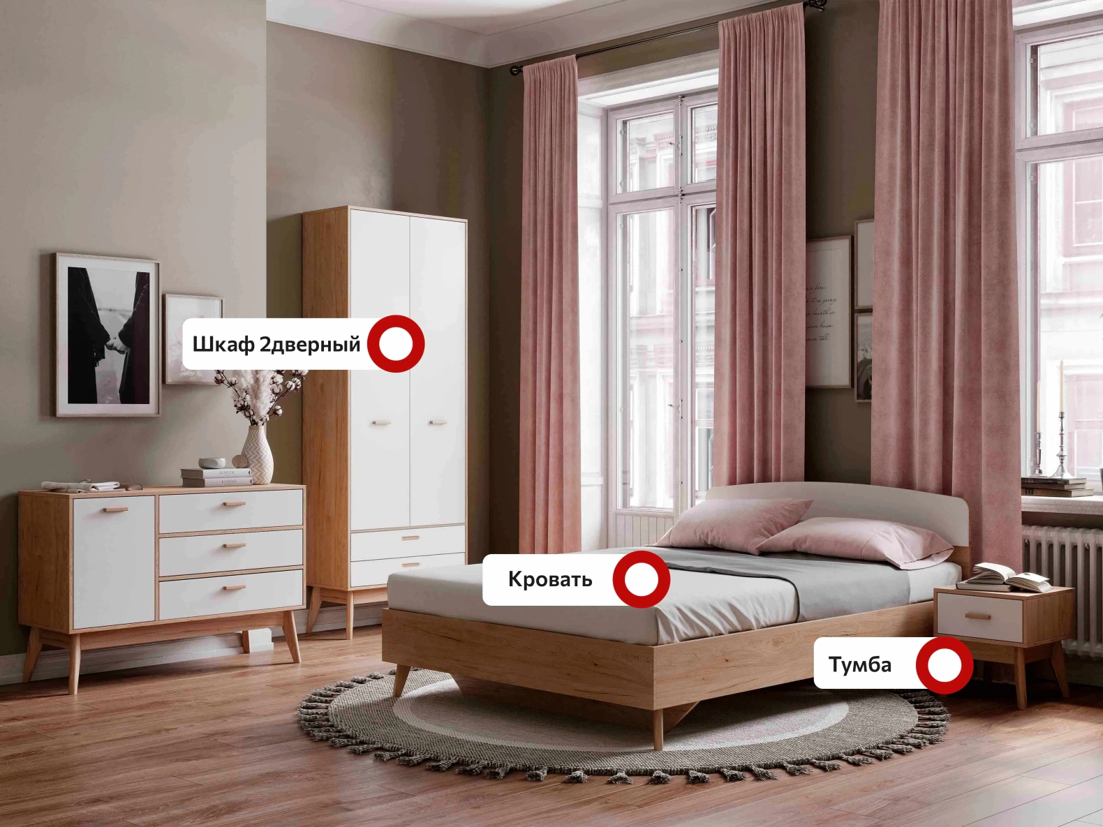 Гарнитур подходит как для просторных, так и для небольших спален, помогая эффективно использовать пространство и создавать уютное и светлое место для отдыха и сна.