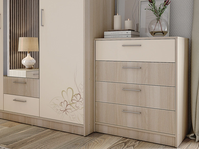 Корпус спальни изготовлен из 16 мм ламинированной древесностружечной плиты. Торцевые поверхности корпуса закромлены кромками ПВХ и ABS. Фасады изготовлены из 16 мм ламинированной древесностружечной плиты. По периметру фасады закромлены кромками ПВХ и ABS.