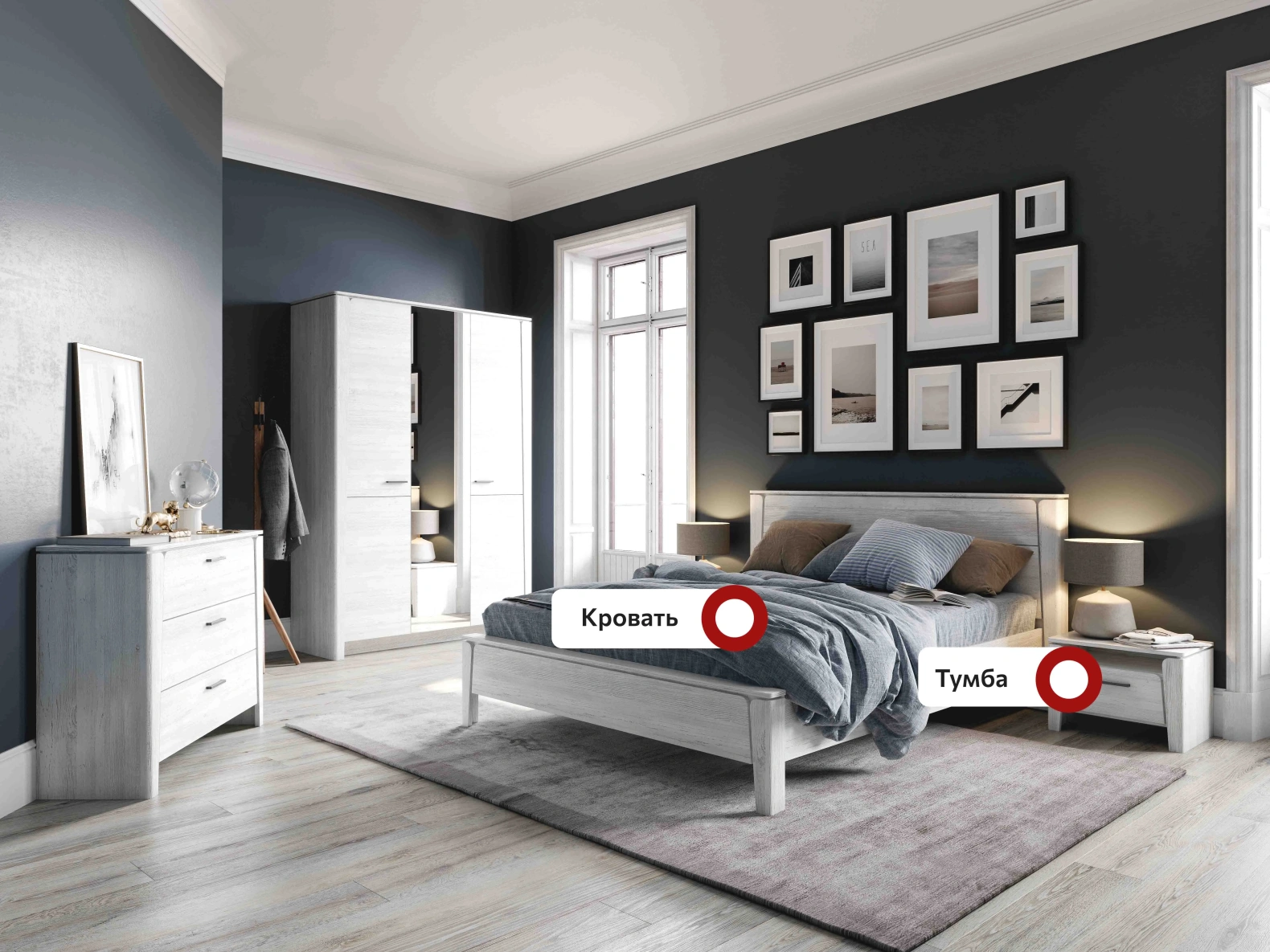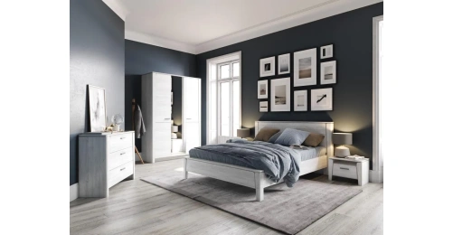 В состав гарнитура входят различные элементы, которые позволят вам создать уютную спальню, такие как: шкаф двухдверный, шкаф трёхдверный, туалетный столик, комод с тремя ящиками, тумба с ящиком, кровать.