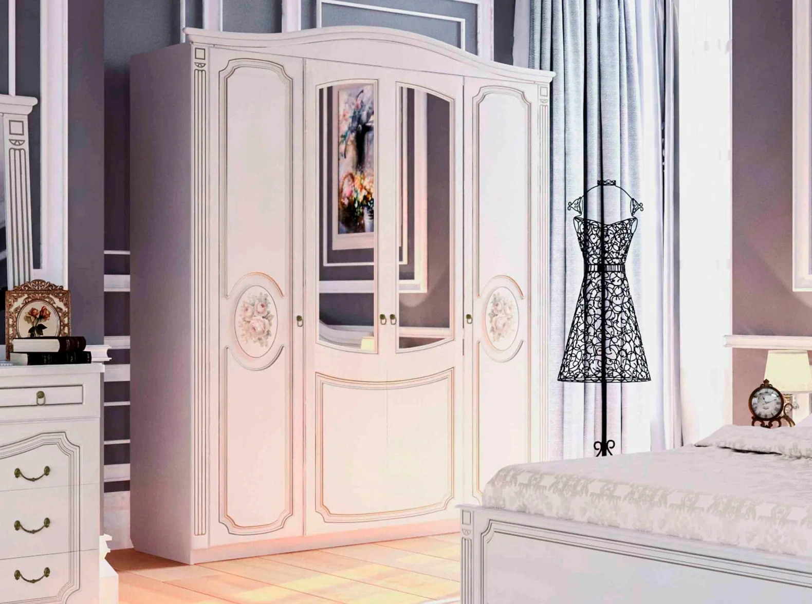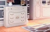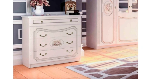 Фасады мебели декорированы элегантной фрезеровкой с эффектом патины и медальоном, на котором изображены розы. Для удобства использования ящики оснащены темными металлическими ручками, имитирующими ковку.