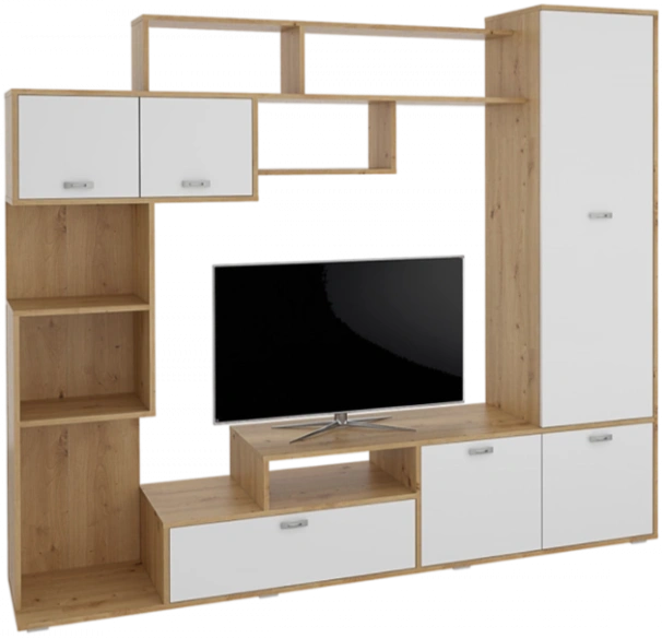 Диско – корпусная мебель, выполненная в оригинальном ассиметричном дизайне, который придется по душе ценителям стиля “модерн”. Вместительные полки, идущие уступами, смотрятся оригинально и могут разнообразить интерьер не только гостиной, но и спальни или детской комнаты. Наличие широкого шкафа и ящиков (выдвижных и с дверцами) делает комплект более функциональным – в них можно хранить постельное белье, игрушки и другие необходимые вещи, а высота в 181 см позволит дотянуться до полок даже ребенку.