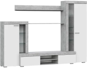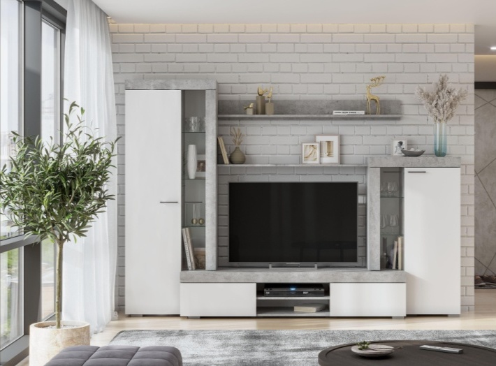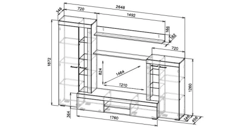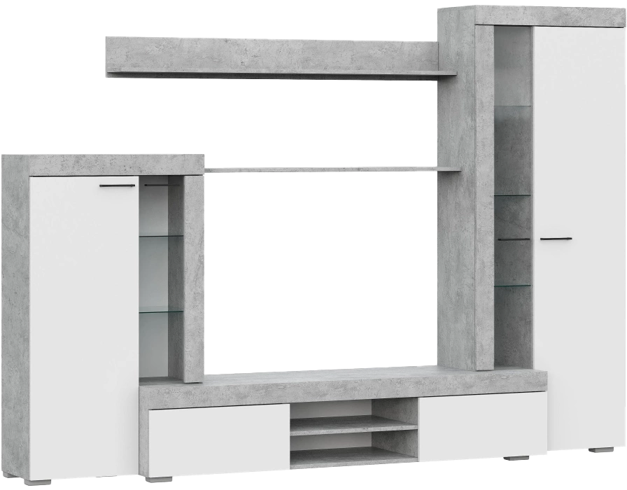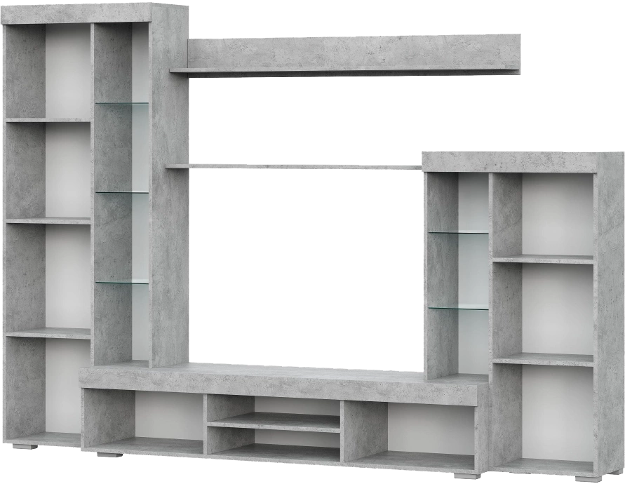 Готовая гостиная Swede, изготовленная из ЛДСП, является интересным и функциональным решением для обустройства гостиной. Она имеет большую нишу под ТВ размером 121 * 82 см, что позволяет разместить телевизор до 47 дюймов. Два закрытых шкафа расположены по обе стороны ниши. Левый шкаф содержит 4 полки внутри, а также 3 стеклянные полки снаружи. Правый шкаф имеет 2 закрытых полки внутри и 2 стеклянные полки. Над нишей расположены две открытые длинные полки, а под ней - 2 закрытых шкафчика и 2 открытые полки.