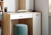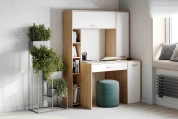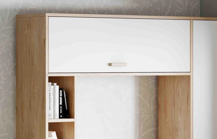 Внутреннее пространство разделено на 3 закрытых зоны: правая зона оснащена 1 съемной и 3 жесткими полками. Левая зона представлена в виде открытой ниши с полками. Верхнее отделение разделено на 2 части перегородкой. Под столешницей расположен ящик на шариковых направляющих.