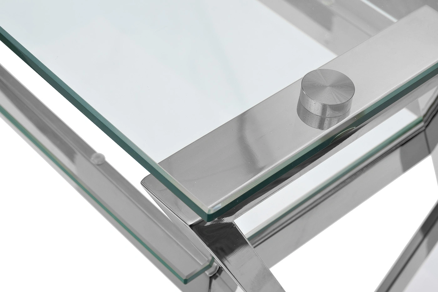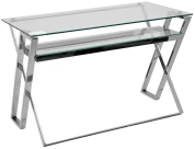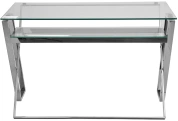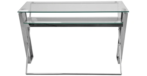 Дизайнерский письменный стол отлично справится не только с главной функцией, но и эффективно решит декоративные задачи. Легкости и изящества мебели придает прозрачная столешница из стекла, полочка для письменных принадлежностей и каркас из нержавеющей стали с эффектным хромированным блеском. Стеклянный письменный стол – необычный предмет, который выглядит весьма оригинально в интерьере рабочего кабинета, комнаты подростка. Превосходный выбор для современных интерьеров в стиле аристократичного ар-деко, дорогой неоклассики и смелого модерна.