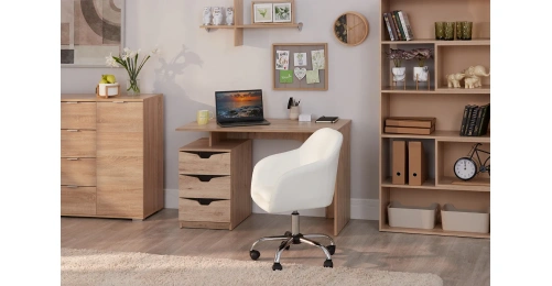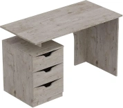 Стол изготовлен из качественных, безопасных материалов, что гарантирует его надежность и долговечность. Он оснащен тумбой с тремя ящиками, которые идеально подходят для хранения документов и канцелярских принадлежностей. Также на столе есть место для монитора компьютера и клавиатуры. На фасаде имеются декоративные вырезы, выполняющие функцию ручек.