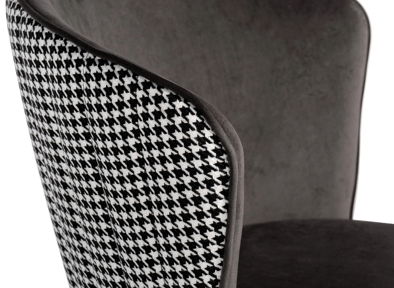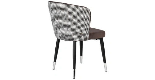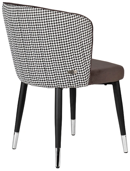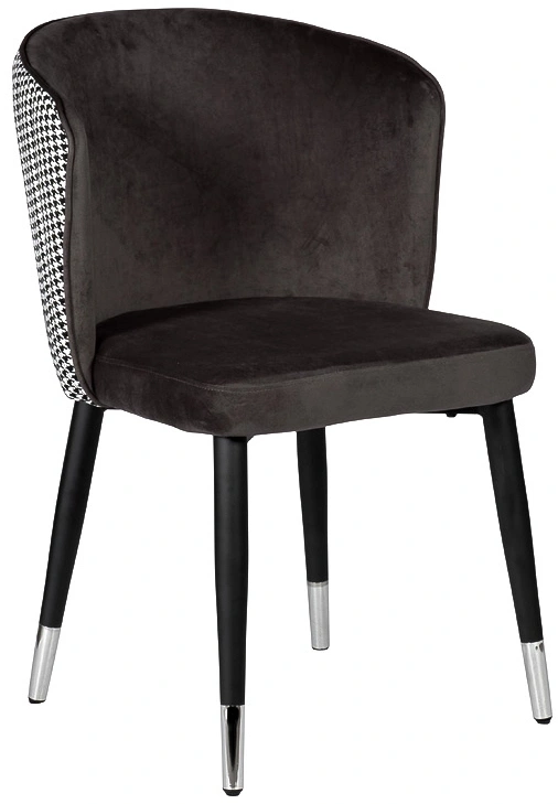 Оригинальный стул выполнен в комбинации приятного серо-коричневого велюра на лицевой части и текстиля с орнаментом "гусиная лапка" на тыльной части спинки. Оформление спинки - гладкая внутренняя поверхность и волнистая внешняя форма с вертикальной прострочкой. Габариты сиденья: ширина 47см, глубина 45см, высота от пола - 48см.