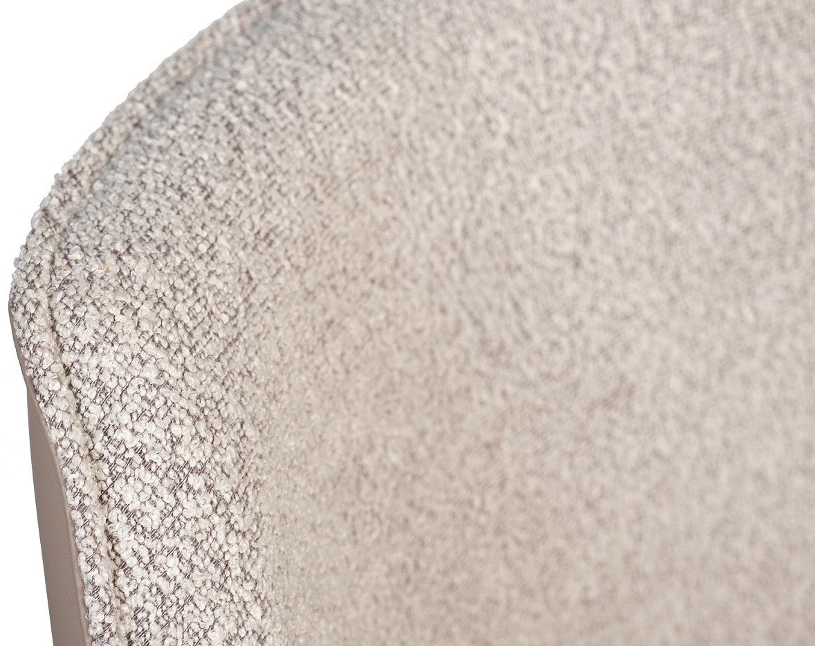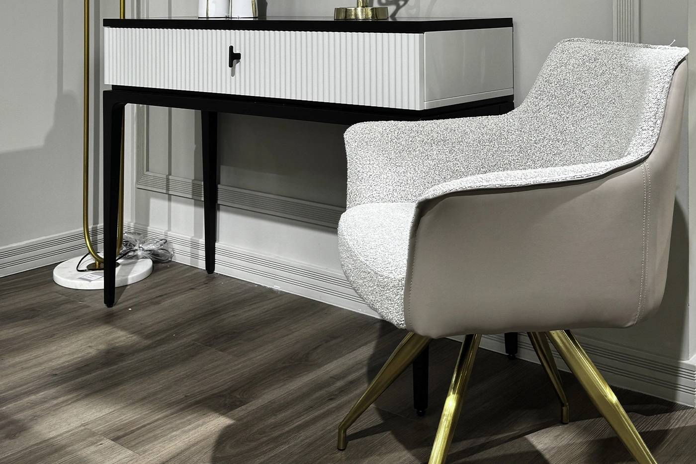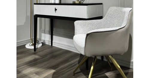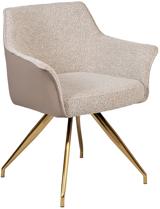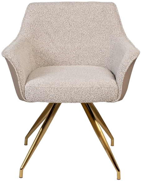 Изысканный обеденный стул с вращающимся сиденьем и обивкой из роскошной ткани букле. Этот уникальный предмет мебели станет настоящей изюминкой вашего интерьера. Сочетание мягкой текстуры букле и экокожи на оборотной стороне с блестящим золотистым каркасом создает неповторимый контраст и придает стулу элегантный вид. Стул обеденный вращающийся с обивкой из букле – это идеальное сочетание комфорта и стиля. Мягкое сиденье и спинка обеспечат максимальное удобство во время трапезы, а вращающийся механизм добавит функциональности. Этот стул станет не только прекрасным дополнением к обеденному столу, но и изысканным акцентом в гостиной или кабинете. Обеденный стул с подлокотниками (кресло). Обивка из белой ткани букле с серой основой, внешняя часть – из серо-бежевой экокожи. Основание – сталь цвета брашированное золото с поворотно-возвратным механизмом. После поворота пружина плавно возвращает сиденье в исходное положение. Габариты сиденья: ширина 41,5см, глубина 46,5см, высота от пола 47,5см.