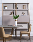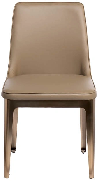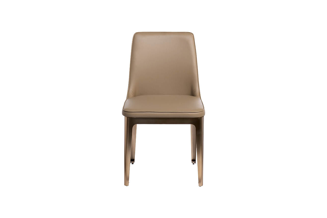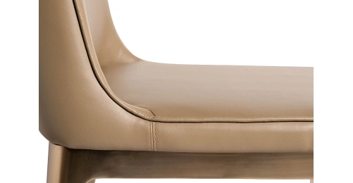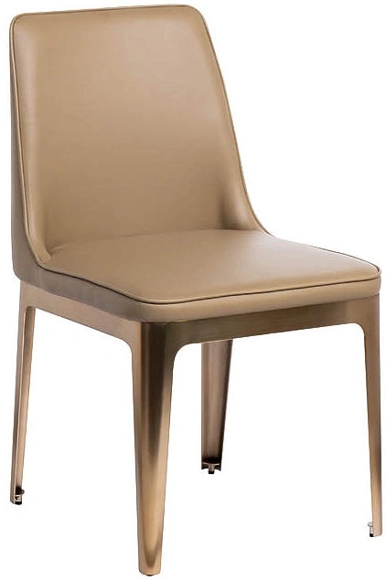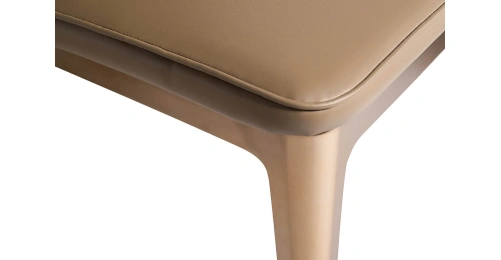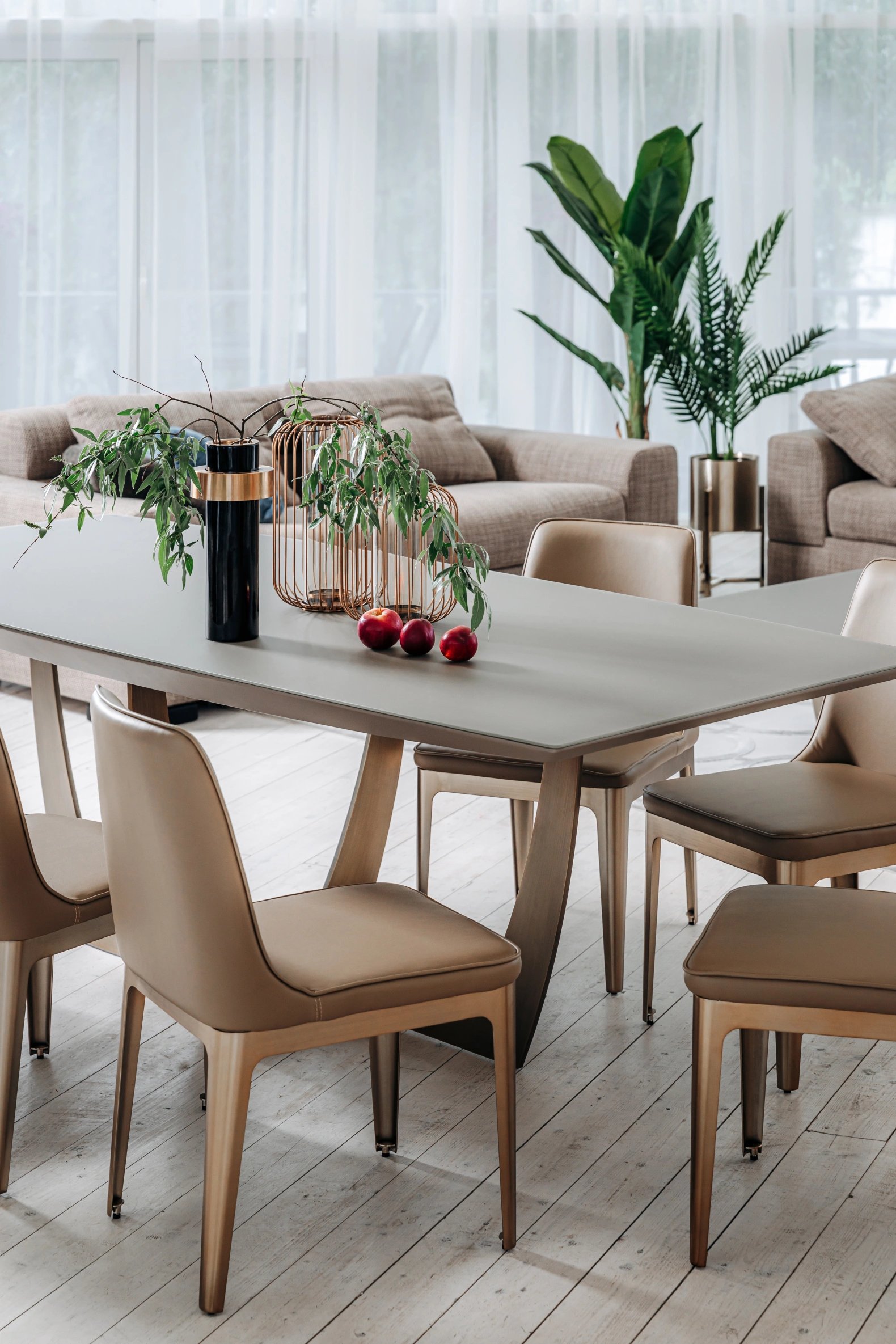 Обеденные стулья из бежевой экокожи от бельгийского дизайнера Тома Де Вульфа подходят к любым столам в современном стиле, выполненным в светлых тонах. Стулья также идеально вписываются в коллекцию Space. Шелковистый блеск зашлифованной стали под бронзу и мягкая экокожа дают ощущение легкости и гармонии. В