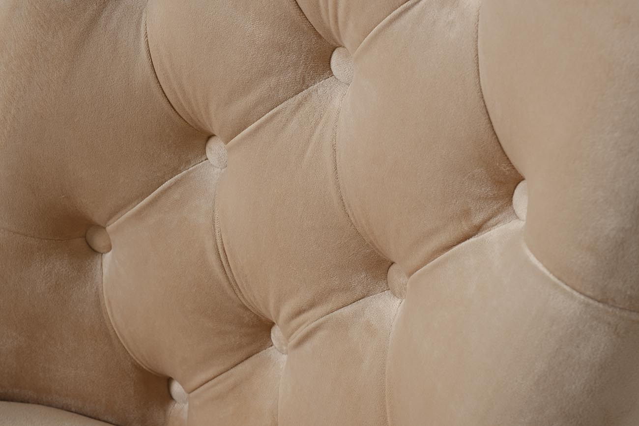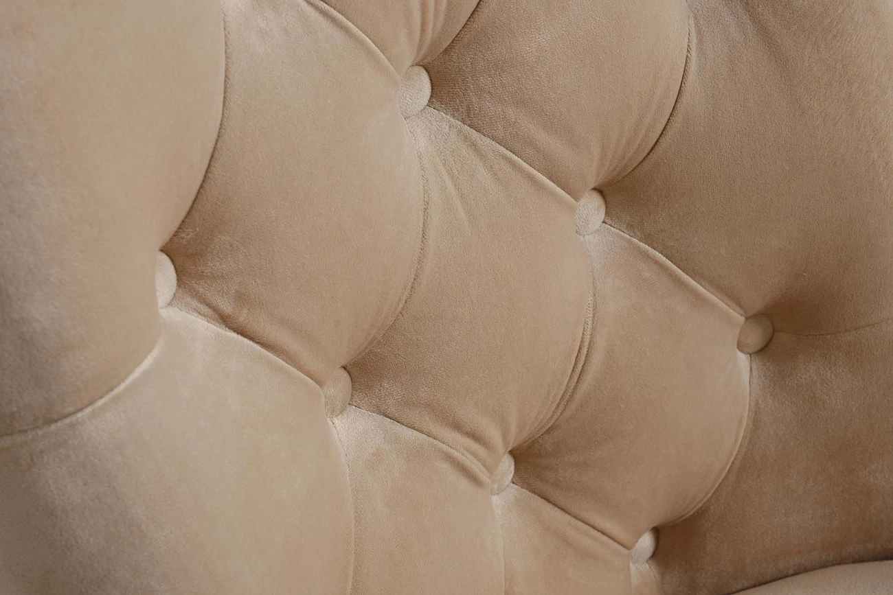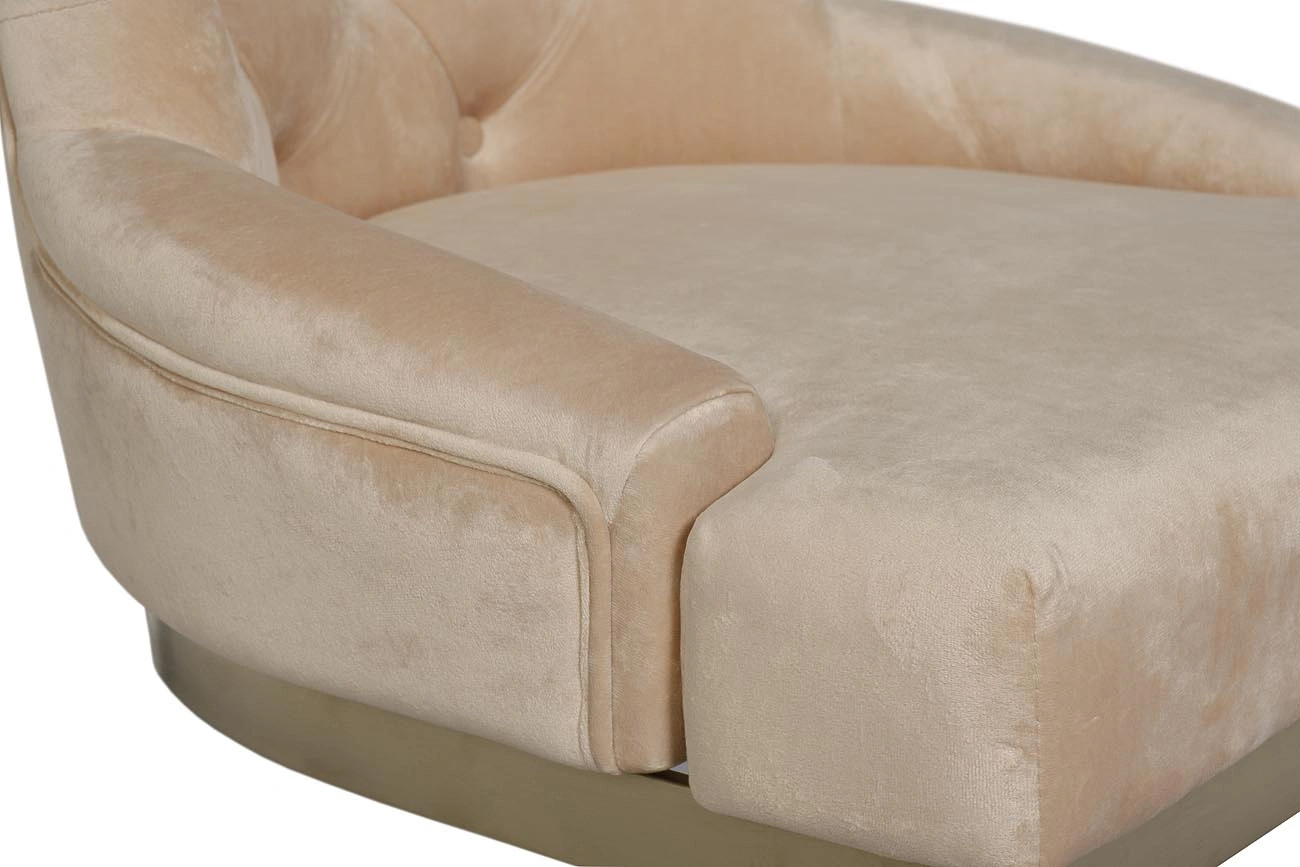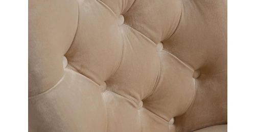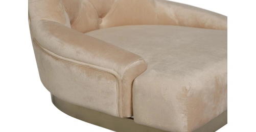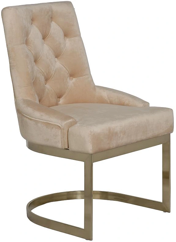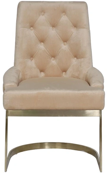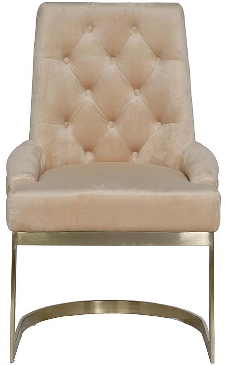 Элегантный стул на металлическом каркасе выглядит статусно и весьма эффектно благодаря каретной стяжке на высокой спинке. Отказ от традиционных ножек в пользу современной опоры из позолоченного металла делает его оригинальным предметом интерьера. За счет такой конструкции бежевый стул выглядит легким, не громоздким, он прекрасно сочетается с другой современной мебелью. Практичная обивка из качественного велюра устойчива к износу и загрязнениям, легко чистится и годами сохраняет свою первоначальную эстетику. Высота сиденья 48см, наполнитель пенополиуретан.