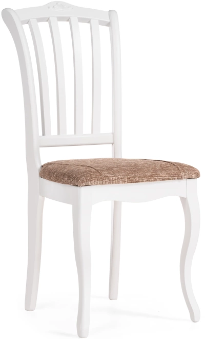 Материал каркаса - Массив березы; Материал сиденья - Ткань; Материал ножек - Массив березы; Материал обивки - Ткань; Цвет каркаса - Белый; Цвет сиденья - Коричневый; Цвет ножек - Белый; Цвет обивки - Коричневый; Ширина - 43; Глубина - 55; Высота - 97; Ширина сиденья - 40; Глубина сиденья - 42; Высота сиденья - 46;