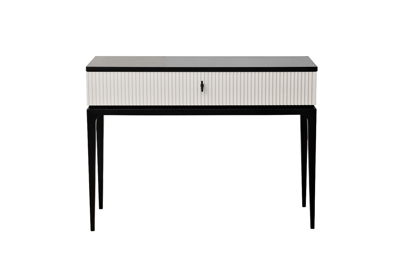 Дизайнерская консоль ESTE в современной стилистике отличается лаконичным дизайном и высокой функциональностью. Сочетание черного каркаса и светло-серой фактурной отделки ящика выглядит стильно и презентабельно. Изящная консоль в гостиной станет эффектным дополнением обстановки и станет отличным местом для хранения документов и важных мелочей. На столешнице будут уместно смотреться вазы, кашпо, шкатулки, фоторамки и прочий декор. В спальне черная-серая консоль отлично справится с функцией туалетного столика, если дополнить ее зеркалом. В прихожей она займет минимум места, но будет отличным решением для хранения ключей, аксессуаров. Черно/серая консоль ESTE с выдвижным ящиком. Габариты:ширина-109см,глубина-40см,высота-80см. RAL 9005/NSC 2002