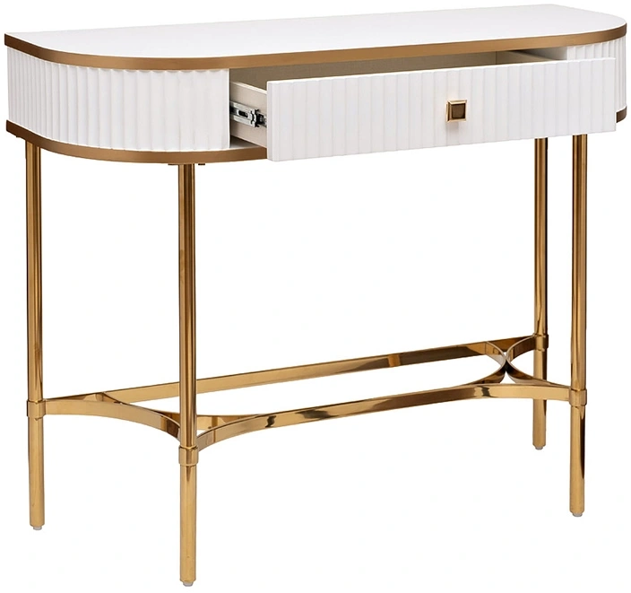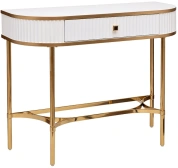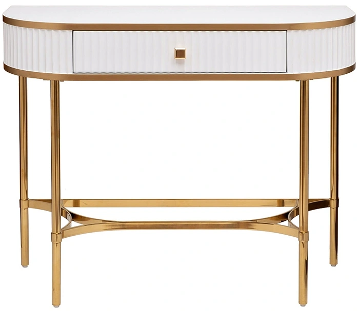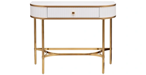 Стильная белая консоль с золотом станет эффектным украшением современного интерьера квартиры, дома. Дизайн простой, но при этом необычный – за счет основы и декоративных элементов из позолоченной блестящей стали консоль с ящиком выглядит аристократично. Она органично впишется в стилистику ар-деко, неоклассика, фьюжн. Небольшие габариты позволяют использовать эту модель в любой комнате: в спальне она легко справится с ролью туалетного столика, в прихожей станет местом для хранения ключей. Garda Decor предлагает купить консоль в гостиную с доставкой, а также любые другие предметы мебели и декора в стилистике современного ар-деко.