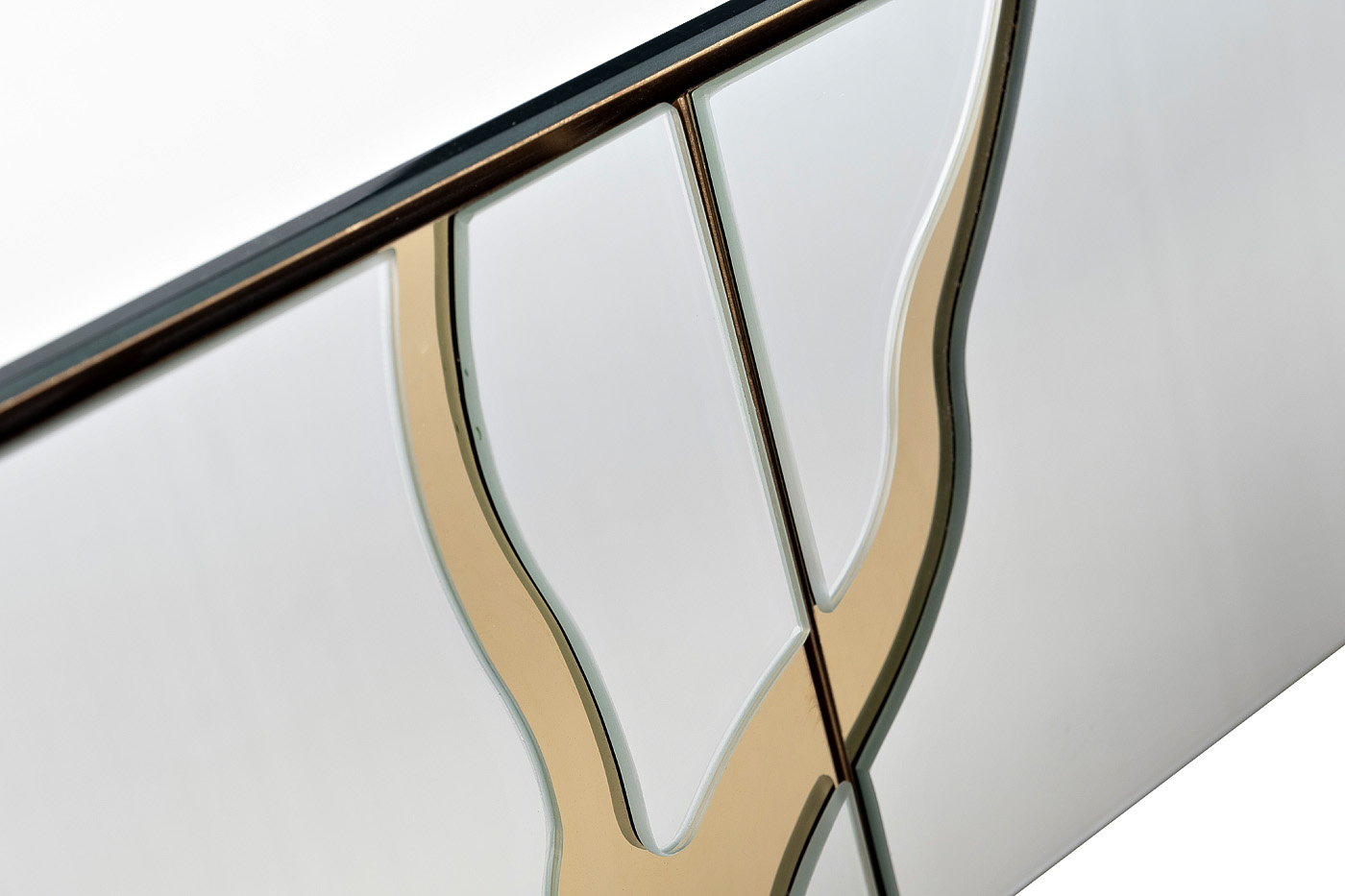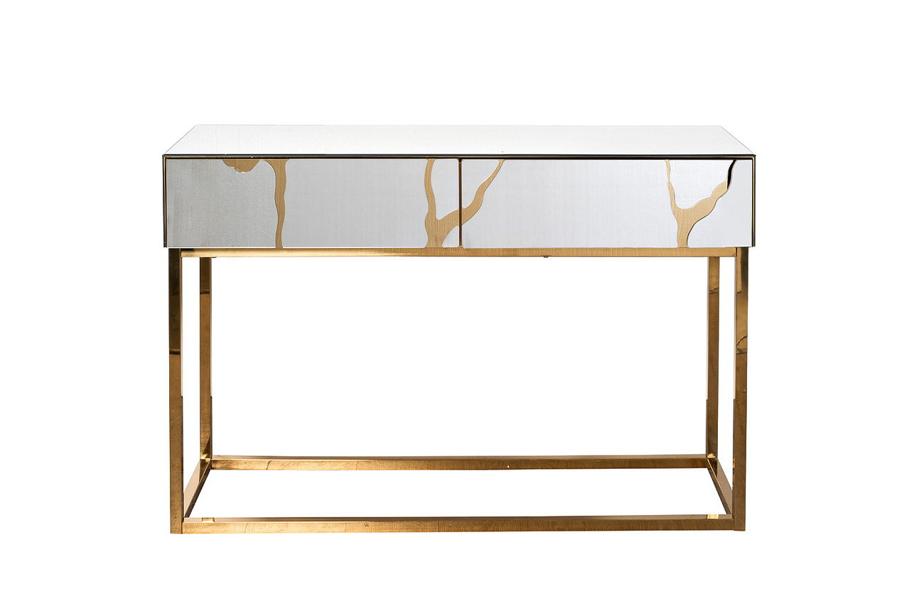 Дизайнерская зеркальная консоль идеально подойдет для роскошных интерьеров в стиле ар-деко. В ней есть все, что нужно, чтобы украсить жилое пространство и добавить ему нотку аристократичного шика. Изюминка мебели – золотой декор, который перекликается с позолоченным основанием из нержавеющей стали. За счет этого стильная консоль в гостиную выглядит роскошно и привносит в обстановку изысканности. Столешница из зеркала станет идеальным местом для размещения разнообразного декора – ваз, статуэток, подсвечников, шкатулок. Консоль с полками компактная, поэтому подойдет для размещения в прихожей, спальне, гостиной. Е