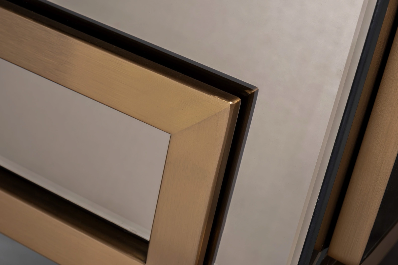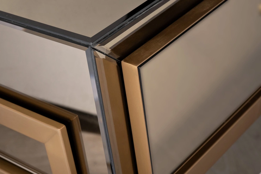Эта консоль с зеркальными фасадами — как драгоценность в интерьере. Её отражающая фактура придаёт пространству эффект визуального расширения и наполненности. Чёткая геометрия форм, лаконичные линии и акценты цвета тёплого металла делают её выразительным элементом для интерьеров в стиле new ар-деко, современная классика или люкс минимализм. Идеальна как зеркальная консоль для гостиной, холла или спальни, она объединяет выразительный дизайн и практичность, сохраняя легкость и элегантную строгость в каждом штрихе.